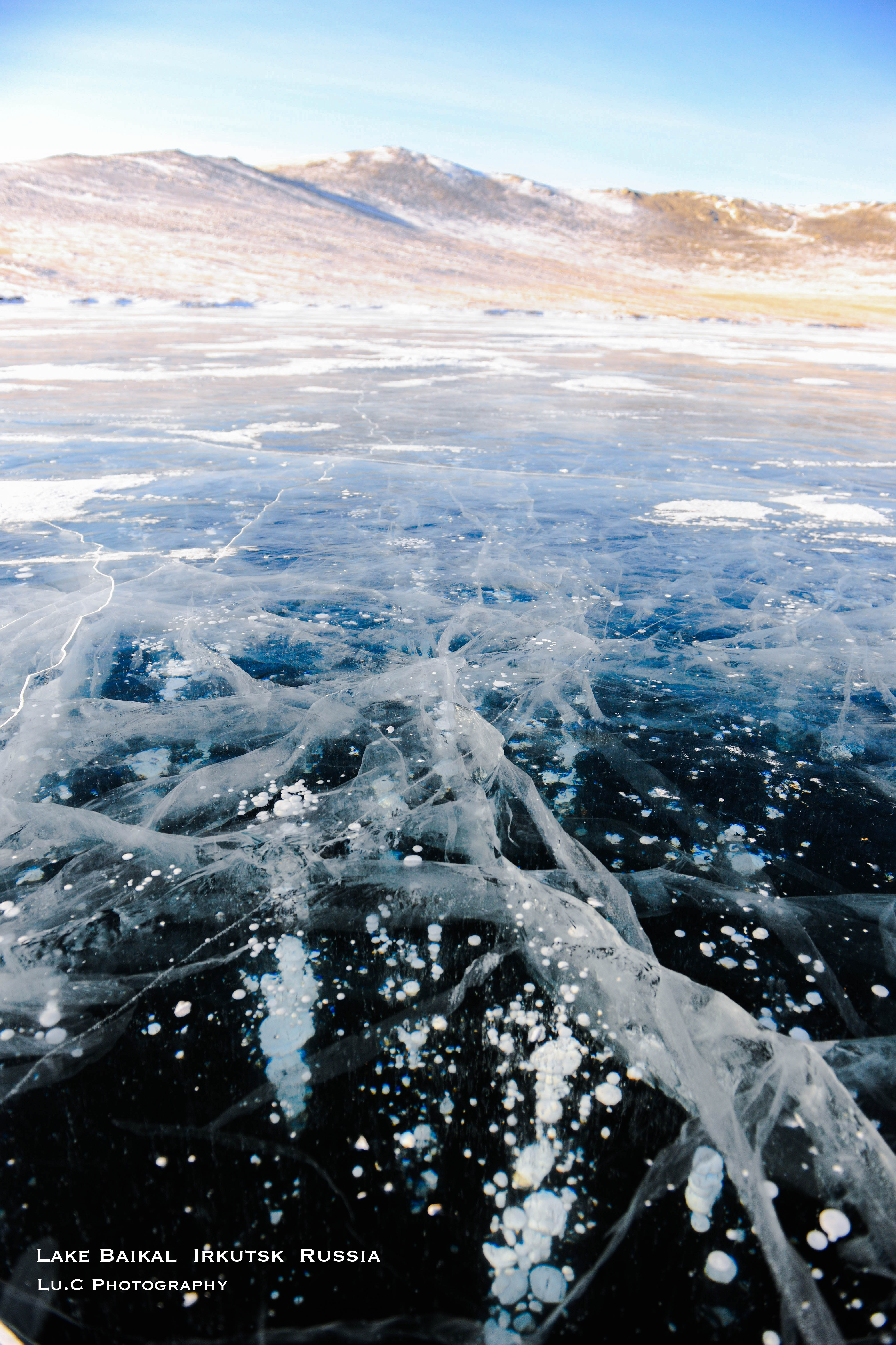 南线最经典的景色就是这些冰冻的湖面下的白色泡泡,这里湖水很深,不像胡日尔邻近岸边都能透过冰面看到湖底的大石头,估计是水里的生物产生的,一串串的泡泡还没来得及跑到空气里就被冻住了,将瞬间而逝的场景变成了一幅长久的画面。