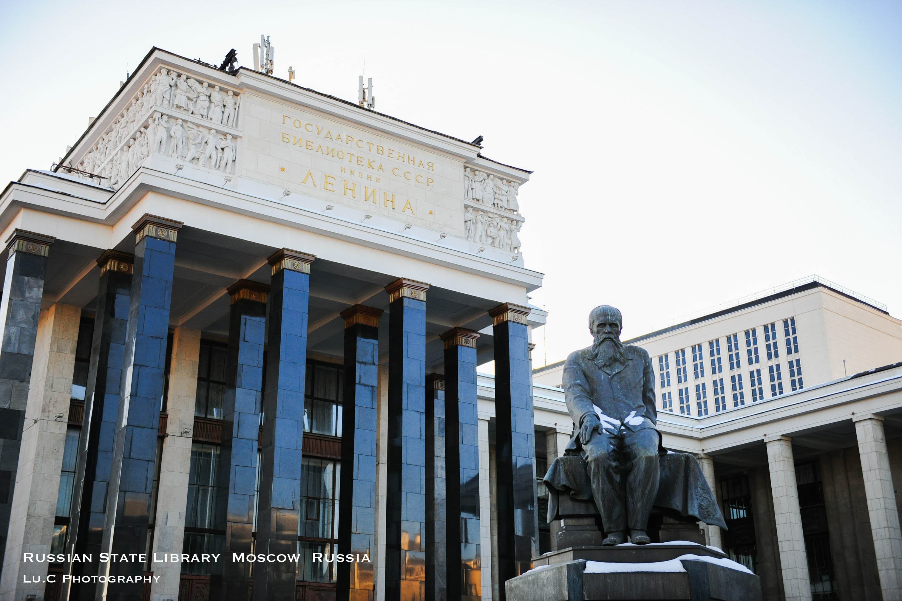 【国家图书馆(Российская государственная библиотека / Russian State Library)】,大多数人还是叫它“列宁图书馆。图书馆门口有一座陀思妥耶夫斯基(Fyodor Dostoyevsky)雕像,因雕像坐姿比较古怪,被莫斯科人称作“马桶上的费佳”(费佳是他的小名)。