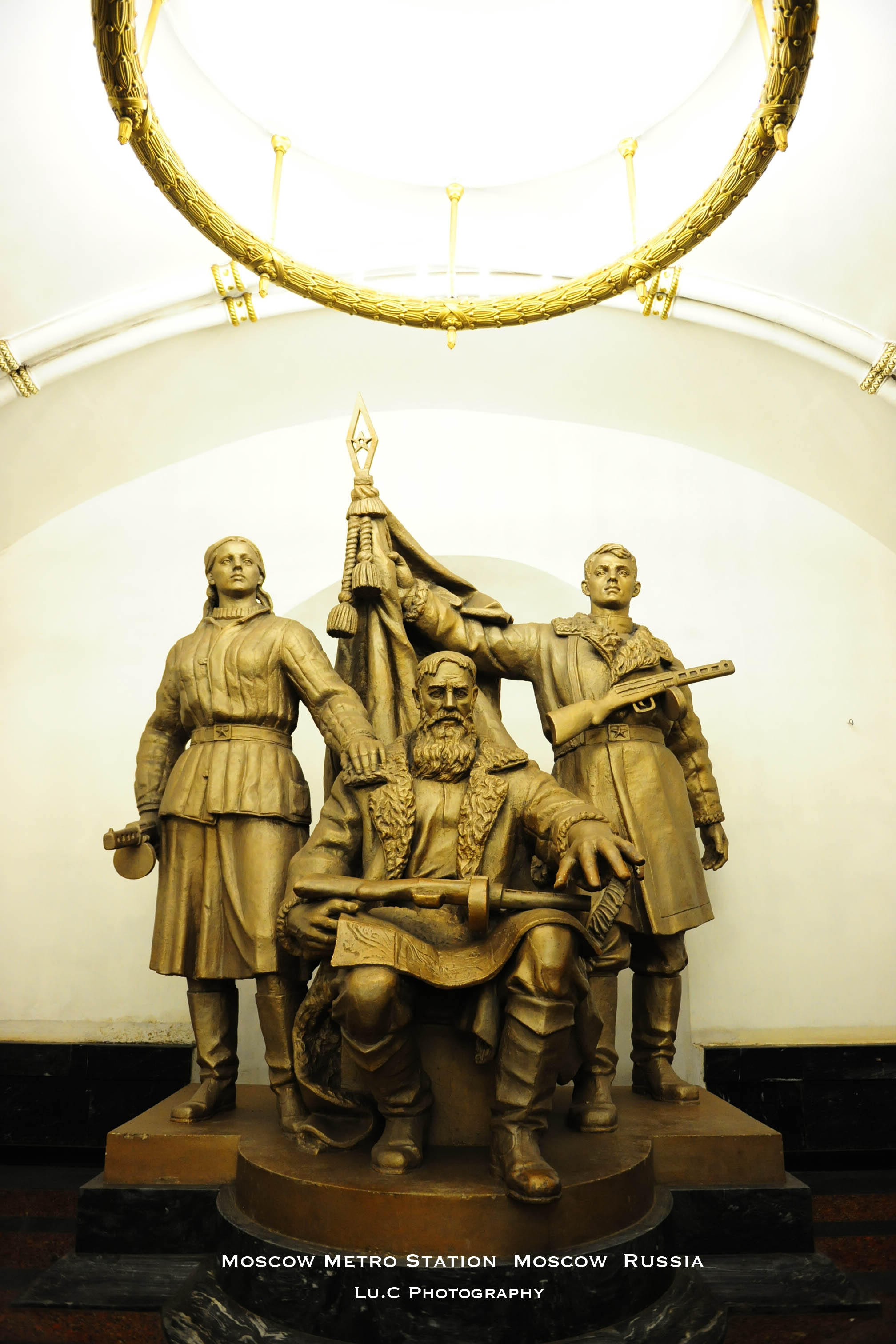 【3号线革命广场站(Площадь Революции)】,这是个以爱国主义为主题的地铁站,通往两侧站台的拱门两侧,蹲坐了一个个栩栩如生的铜制雕塑,这些脸怒容的游击队员、大学生、运动员、集体农庄庄员,一个个鲜活的面孔定格在了激情澎湃的历史年代,讲述了十月革命胜利和苏联红军反法西斯战争的历史事件。据说,如果触摸军人牵着的狗的鼻子,那么考试将会通过,希望将会被实现,并且整个一天都会很顺利;而如果触摸到女学生的腿,可以期望爱情顺利。