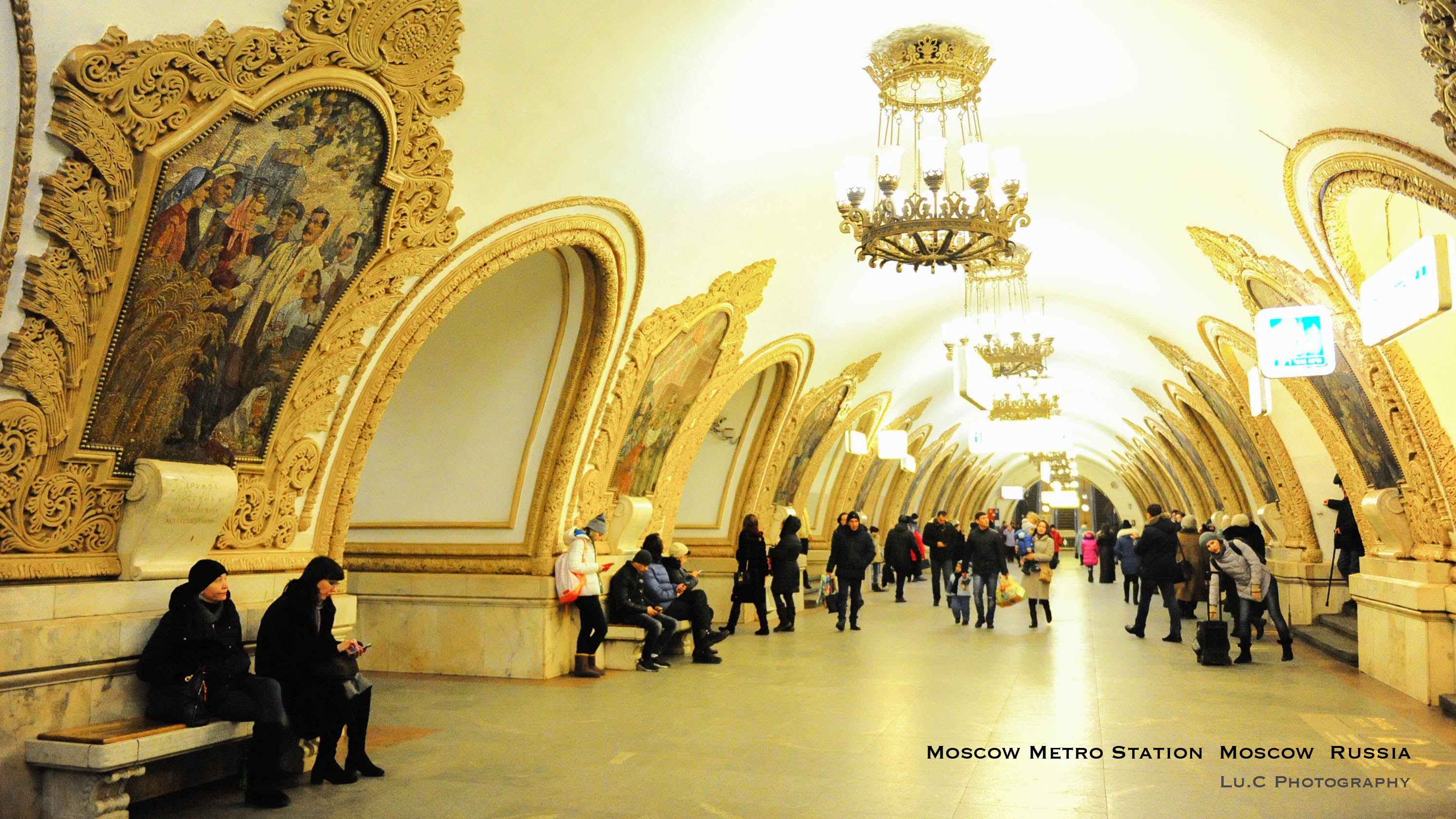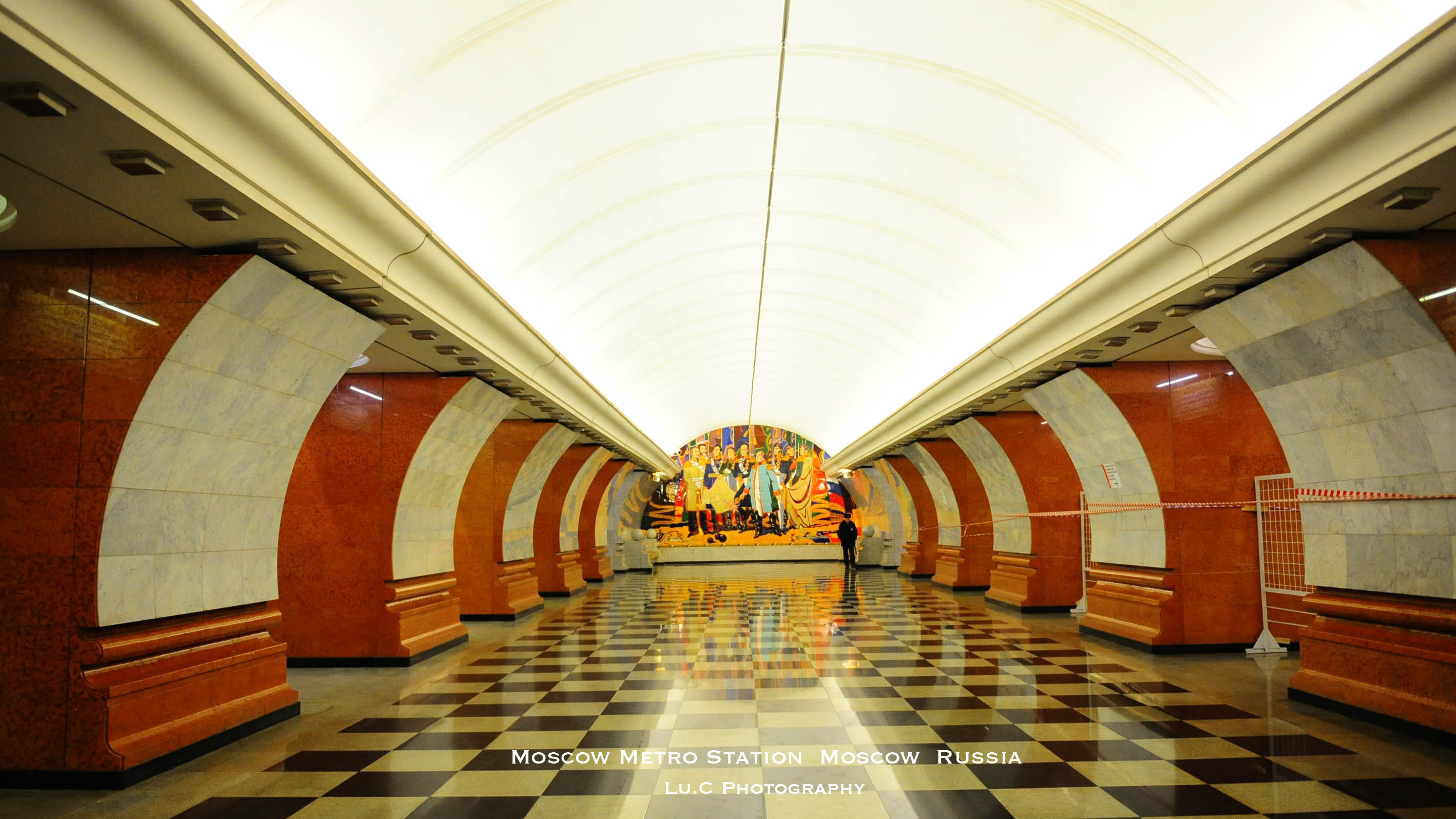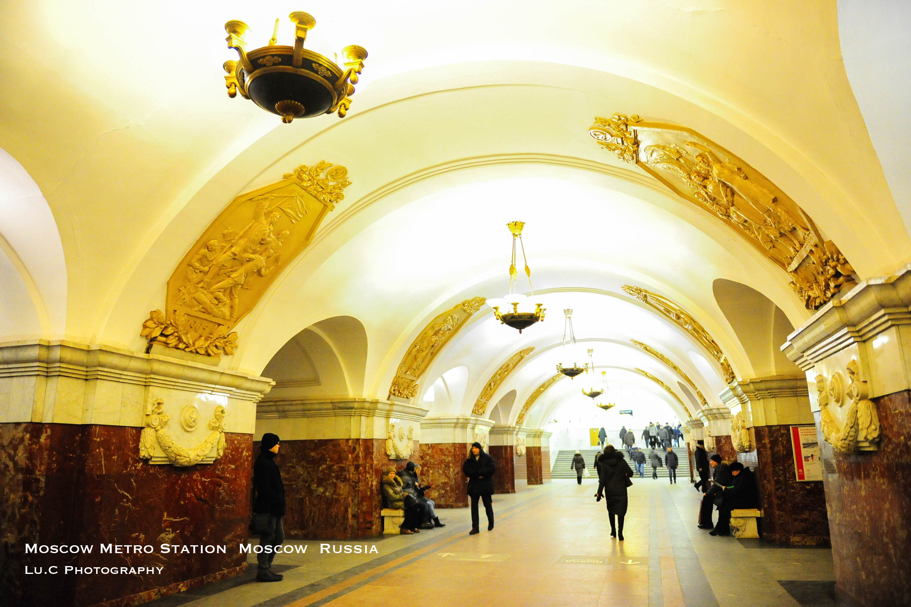 地铁站的格状白色浮雕的天棚,清新脱俗,装饰画都非常精致漂亮,如一幅幅的历史画卷,反映出苏联时期人们的生活状态,让你仿佛置身在一个博物馆里,正在陶醉地欣赏艺术品。