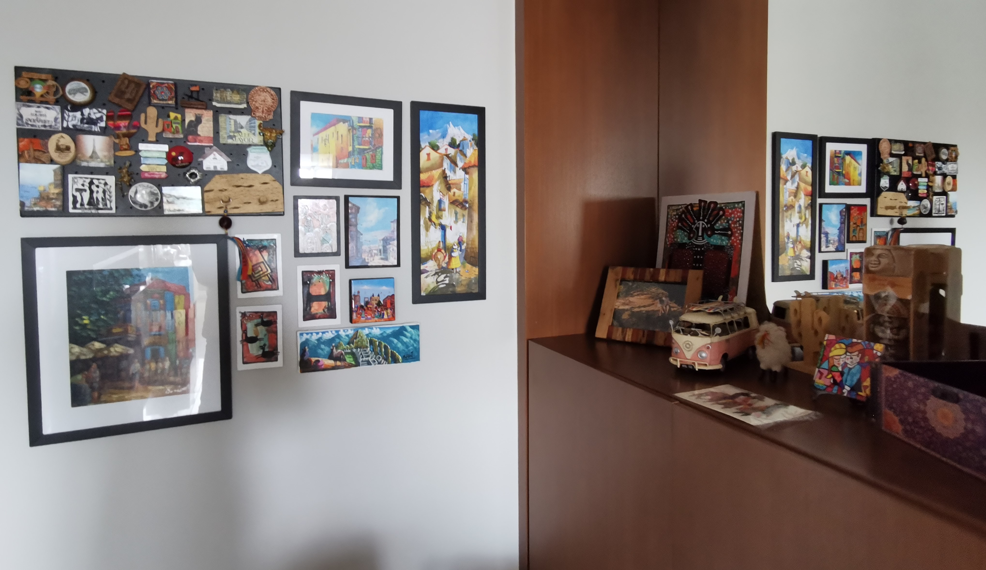 走进他们三室一厅的公寓,明亮又整洁。女孩子总是擅长发现家中的美好事物,我一眼就被玄关处的相片和小物件儿吸引了。“这些都是Rosana布置的,她学建筑,以前做过室内设计师。”家中这些有品位的摆设,让我瞬间对尚未谋面的女主人好奇起来。