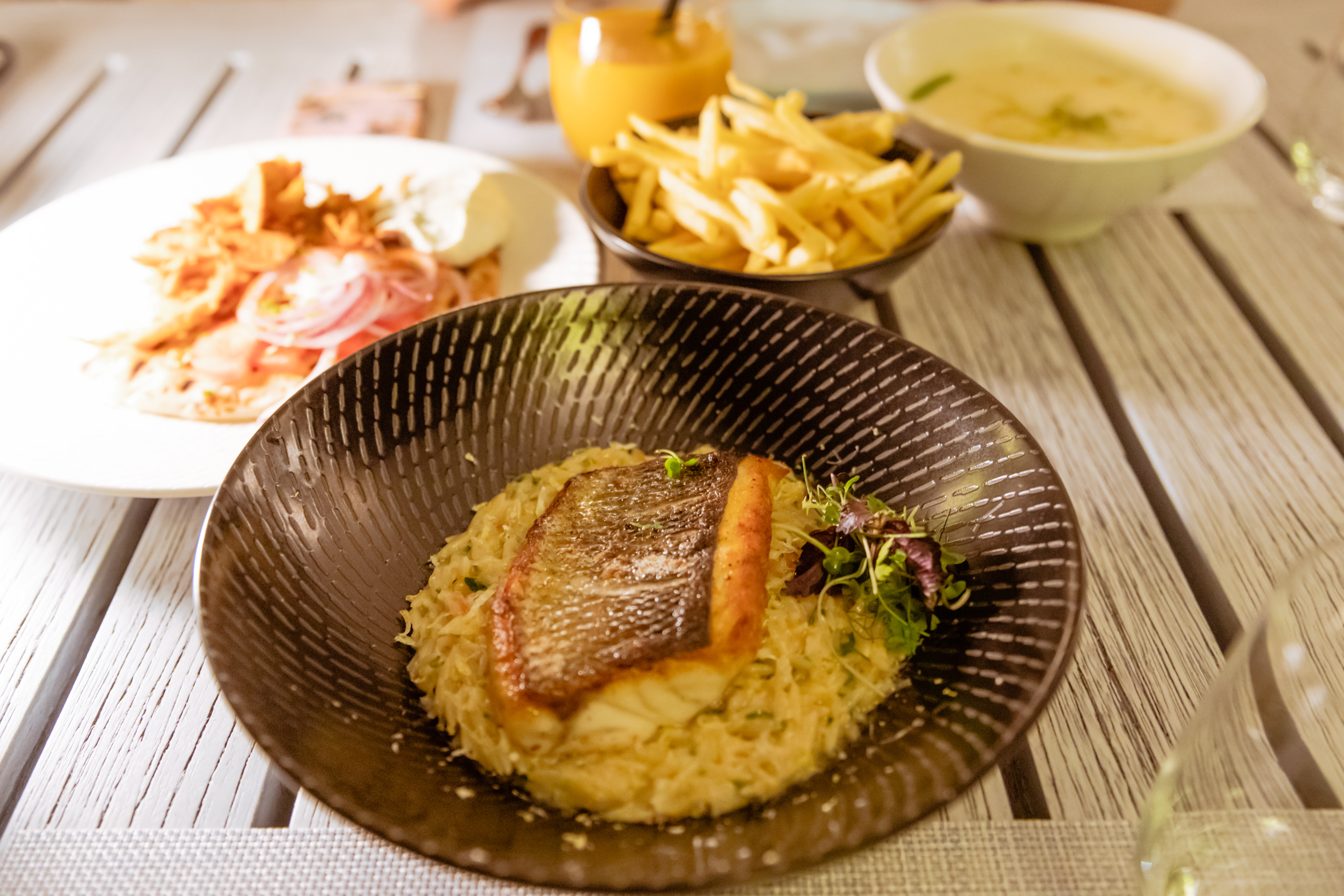 走进餐厅,我们的位置在角落的窗边。浪花轻轻打在我脚边的落地窗上,海面的光影折射上来,仿佛无数星芒跳动,眼前的一切都美轮美奂。