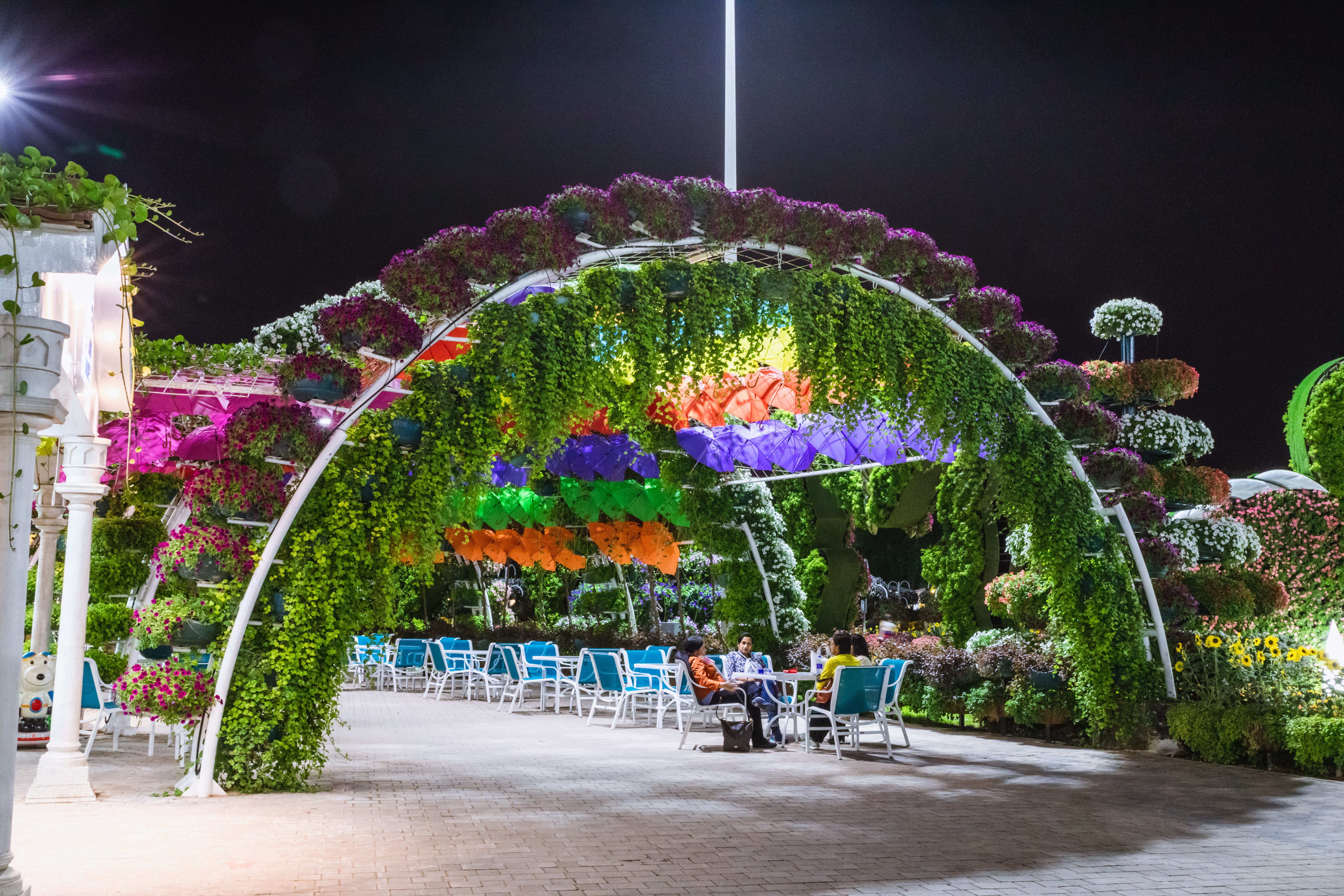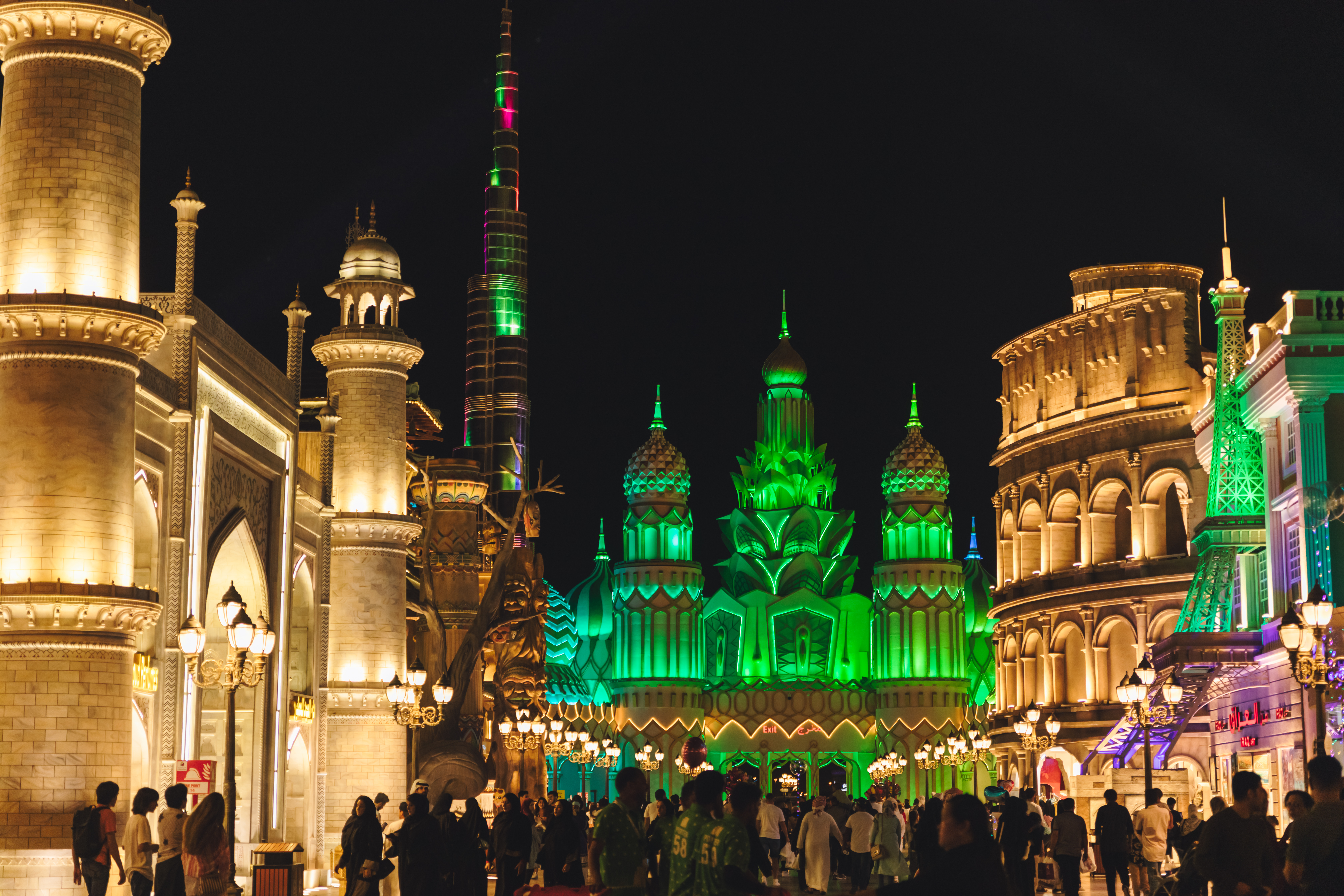 到了夜晚,迪拜之框会变换不同的颜色,金碧辉煌。