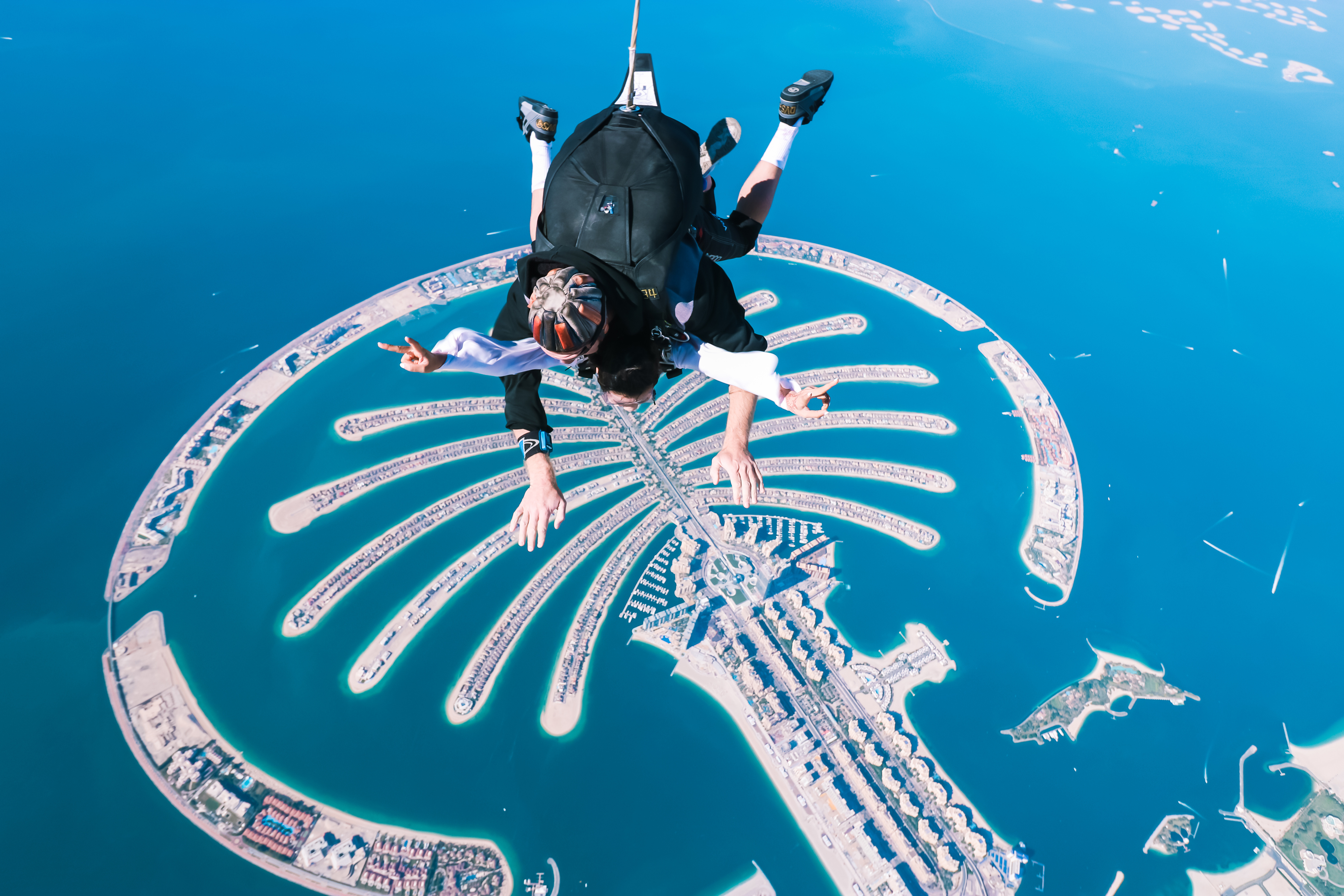 做功课的时候,大家都说飞机上是最紧张的时刻,我等着紧张的感觉袭来,但是不知道是不是我的心理建设起作用了,我竟然没有心跳加速。我告诉自己千万别闭眼,不要错过美景。可是跳出舱的前3秒,我还是不自觉闭上眼,等我反应过来立马努力睁开眼睛,太让人兴奋了,我竟然在做自由落体运动,我正在3000米高空往下坠。肾上腺激素飙升的感觉只有前3秒,之后就完全适应了加速度,只剩下风在耳边呼啸。打开伞后,更是平稳,看到下面的棕榈岛,被美景震撼。