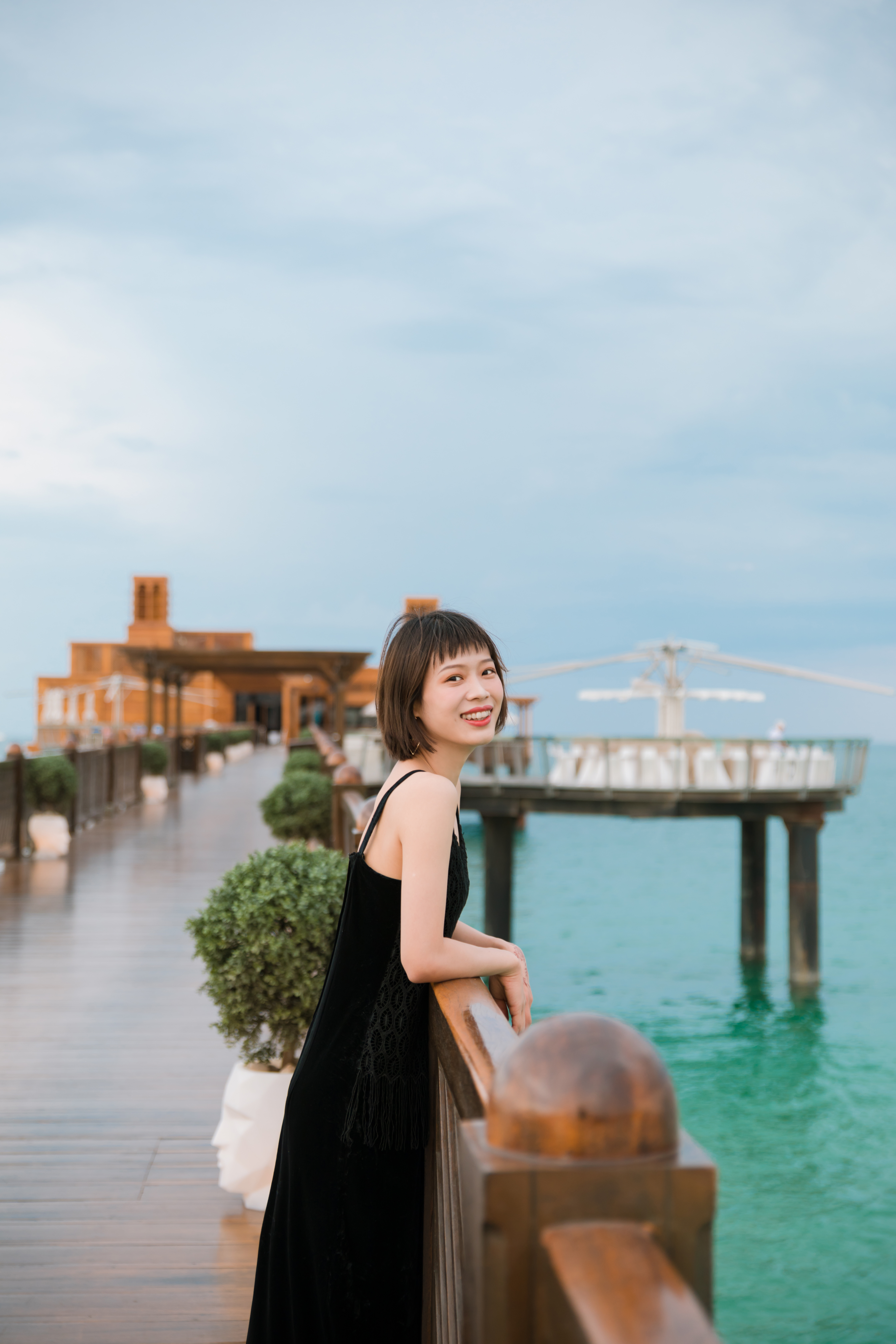 餐厅坐落在离岸几百米的平台上,犹如海上的一座孤岛。沿着木栈道一直往前走,波光粼粼的海面被风吹动,几只海鸥略过海面,帆船酒店就在不远的海里屹立。