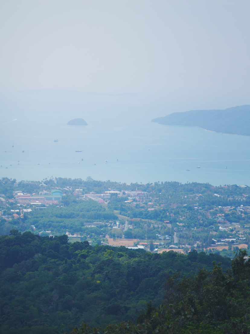 山顶大佛所处的位置很高,视野非常开阔,靛青蓝的大海里有很多船只,有的远航带出了白色的尾巴,有的安静的停留在海面上。零星散落的岛屿好像坐落在一层白蒙蒙的雾里,看不真切。