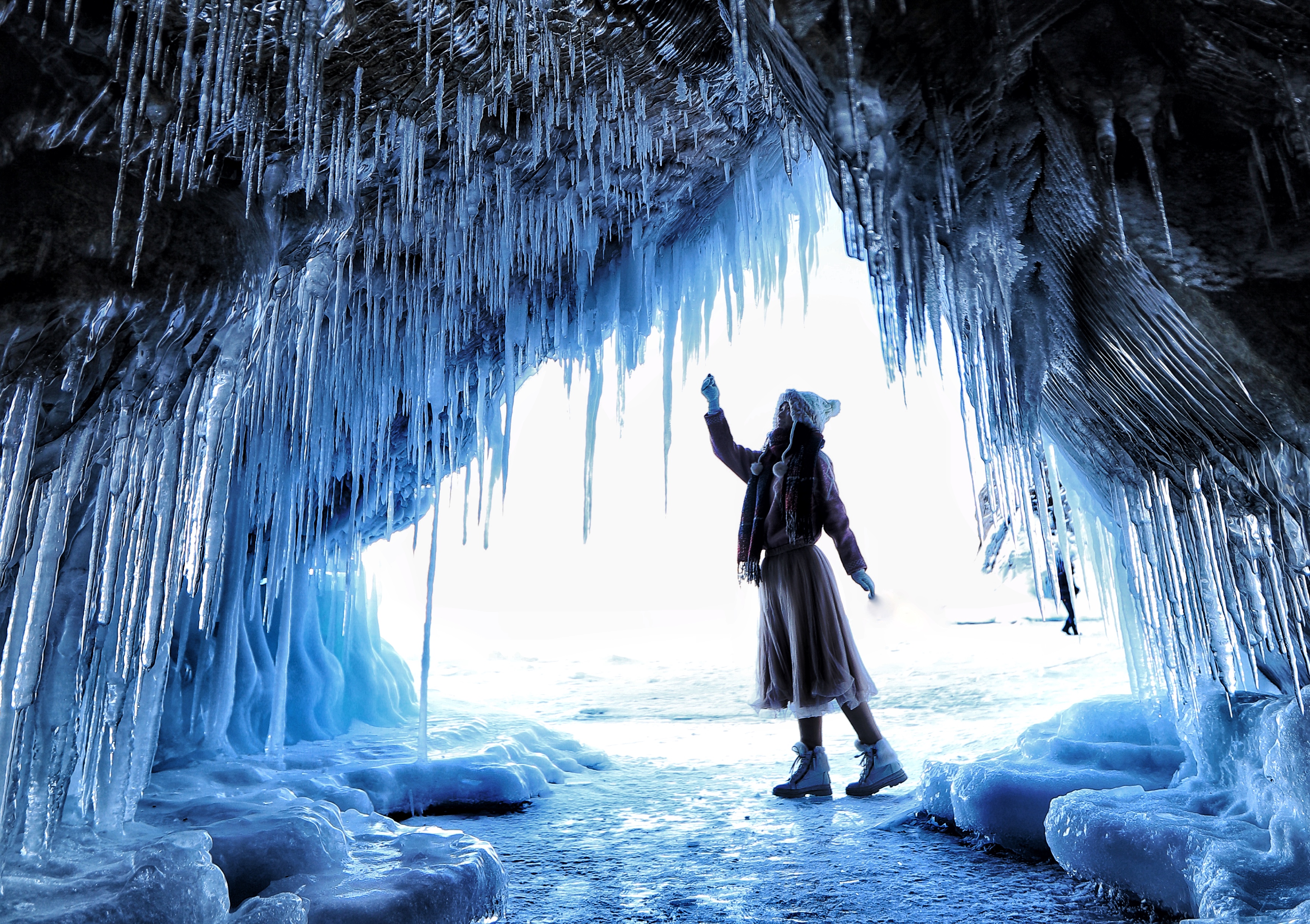 数千个岩洞到了冬季,也变成了冰洞。由海浪拍打岩石,水滴落下凝结成冰,就形成了形状各异的冰柱。
