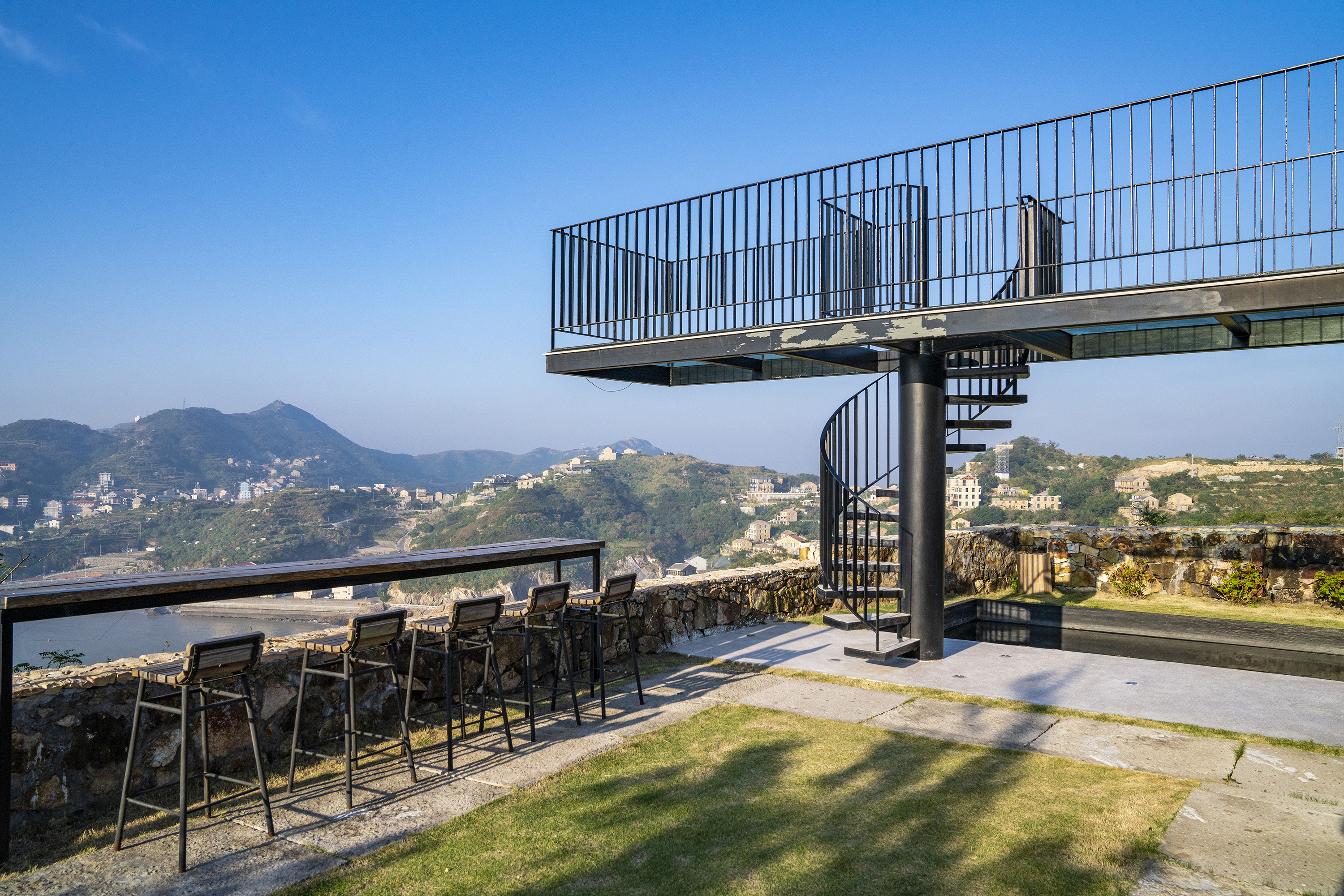 别墅的院子里还有一个悬空观景长廊的设计,站在观景台上,可以俯瞰到整个周边的景色。