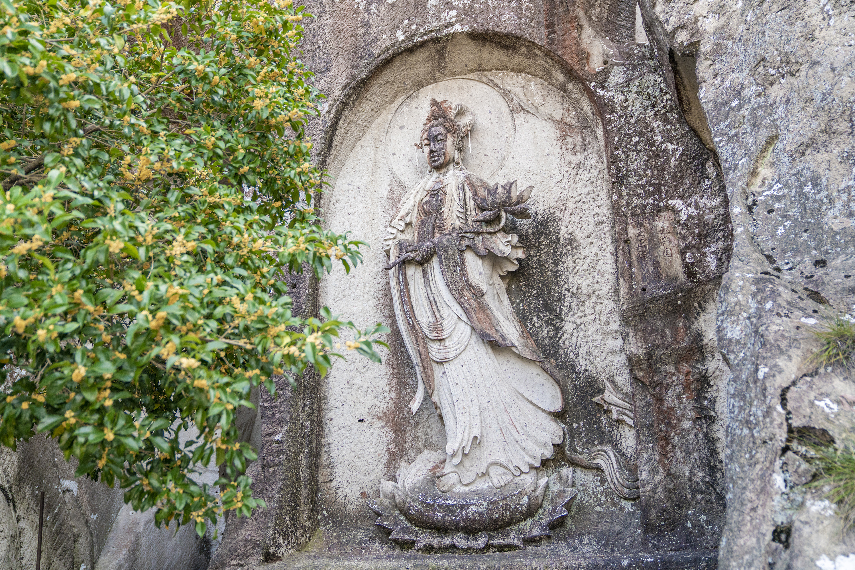 穿过观夕硐的硐穴,山顶上是观音壁,形态各异的观音雕像,神态自若,立体感非常强, 温岭 本就是著名的石雕之乡,这样的石雕作品,自然是不在话下。这些观音像都是由经验丰富的老师傅完成,这里的石材雕刻难度大,由外至内的雕刻手法,必须严谨,不然就很容易前功尽弃。