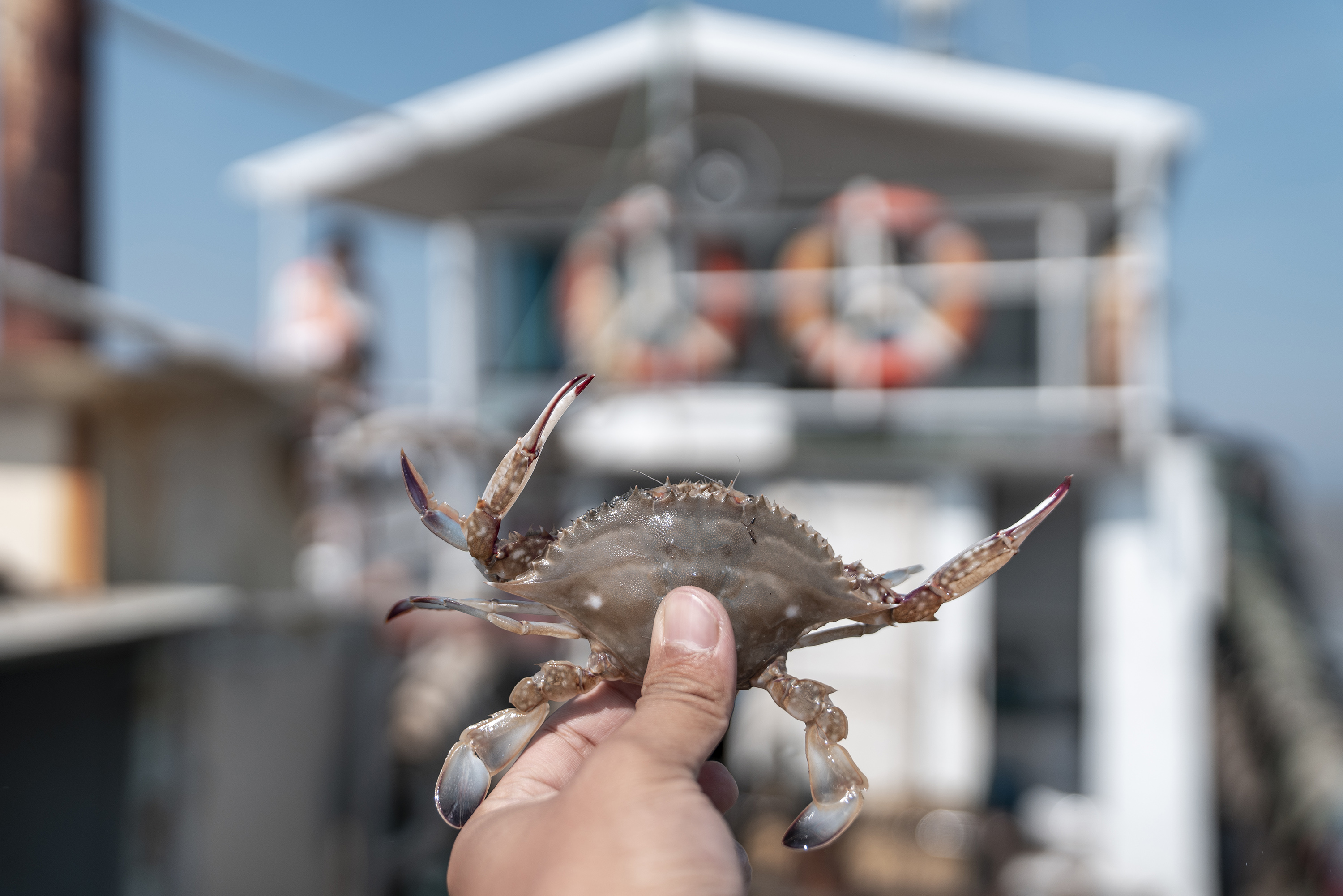 等待的过程也是蛮着急的,也不知道今天到底能收获多少的海鲜,时间到了,可以收网,这个时候就需要两个人一起操作,一人一边将网绳缠绕在机器上,利用机器的力量收网,如此反复,许久才能将渔网全部收回,因为放入海中拖拽的渔网真的很长很长,其实不要小看渔船,渔船上的现代化程度还是很高的。虽然我们是出海体验捕鱼,但是全程也不需要我们动手,对于我们来说就是充满好奇心的感受一次渔民出海捕鱼的过程,其实他们还是非常辛苦的。