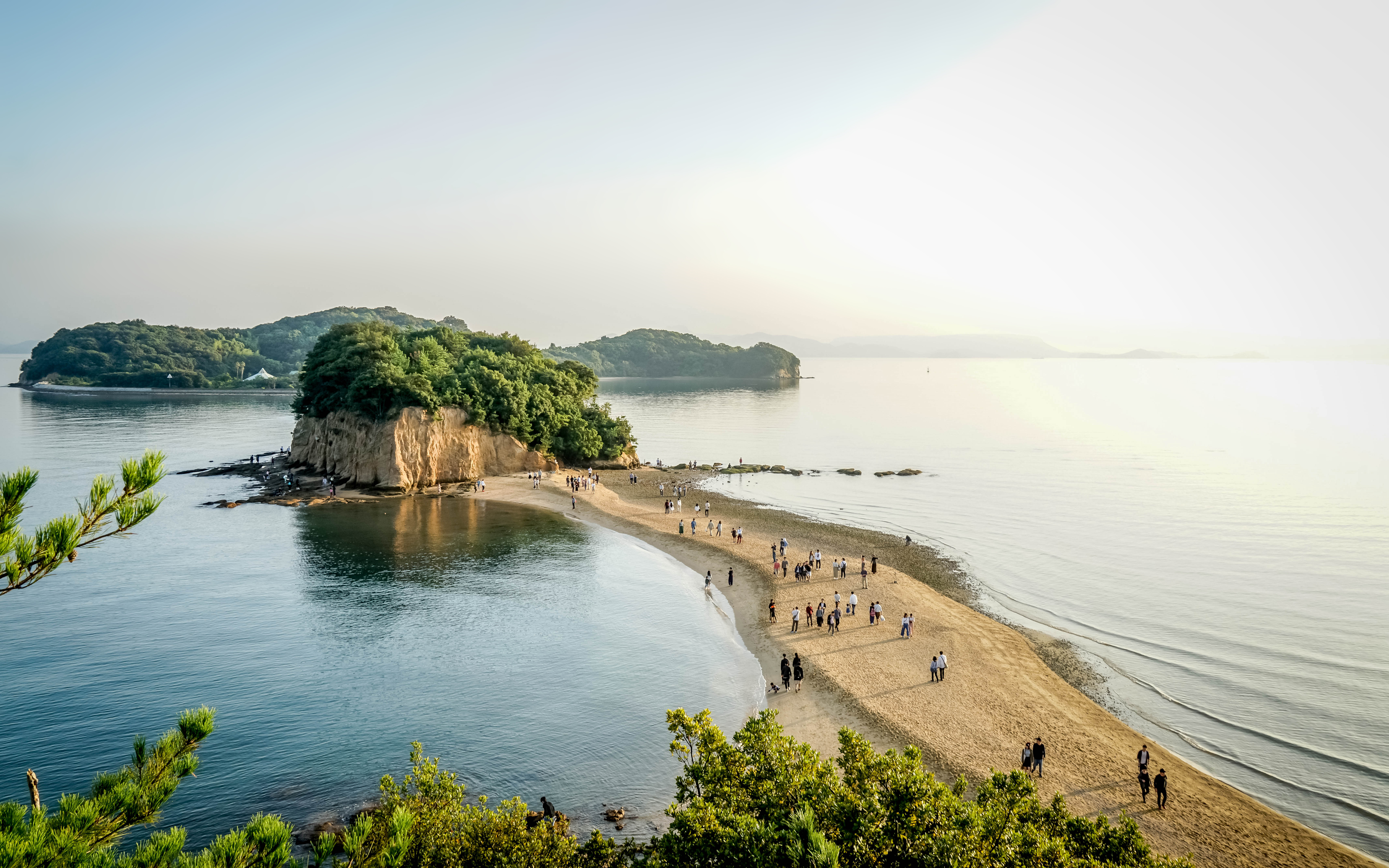 【エンジェルロード(天使之路Angel Road)】小豆岛代表性景点,“Angel Road”指的是连接三座小岛的砂石路,涨潮时海水将道路淹没,三座小岛分离,只有在退潮时才重新出现。这种奇妙的自然现象一天只会在早晚出现两次,每次大约两个小时。传说如果情侣牵手走过这条步道,天使就会降临实现他们的愿望,两人永远幸福快乐地生活在一起,因此这条路就有了“天使之路”这个浪漫的名字。