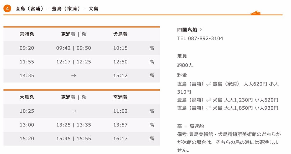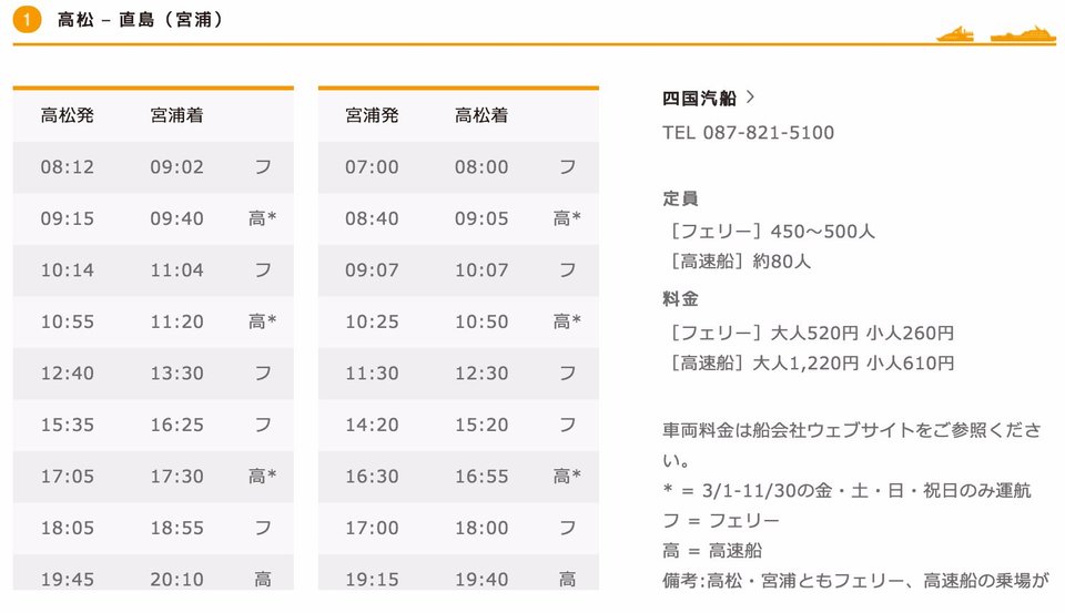 2.船次有可能会因天气、节日等原因调整,建议关注twitter“瀬戸内観光汽船”、“四国汽船@公式”来随时把握船次动态。