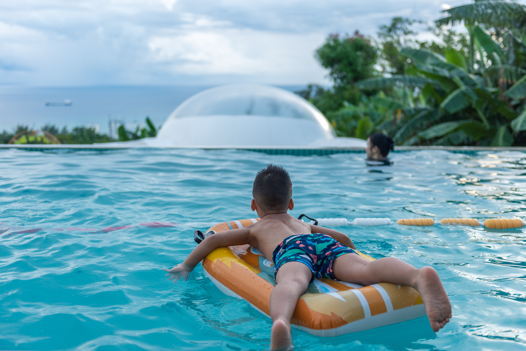 孩子们早就对民宿的无边际泳池蠢蠢欲动,吃完饭,在他们的强烈要求下,决定回去让他们好好玩玩水。