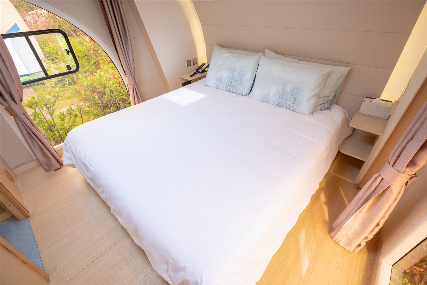房车装修以原木色为主调,舒适的大床颇有设计,床单上的印花将百亩樱花林再现,窗外绿树掩映,满屏的清新之意让人挪不动脚。这里四季皆景,春季樱花烂漫,夏季蛙噪蝉鸣,秋季瓜果肥美,冬季落雪赏梅,总有一刻令你心动。