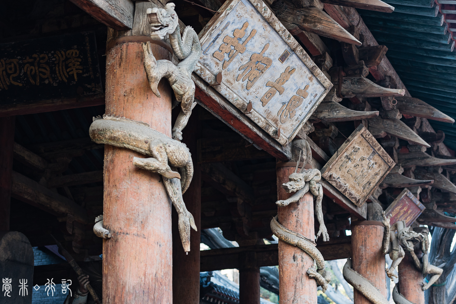 晋祠古建三绝之二,是圣母殿前柱上的木雕盘龙。这是我国现存最早的盘龙雕柱,雕于宋元佑二年(1087年),八条木龙各抱一根廊柱,怒目利爪,栩栩如生。