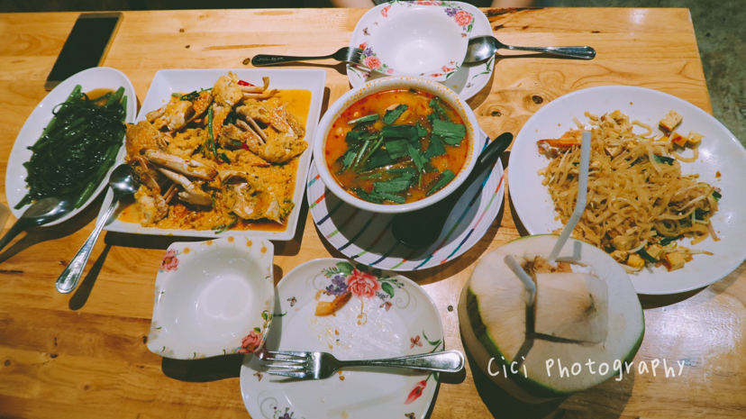 ❤️2、拉差达火车夜市:在拉差达火车夜市随便找了家店吃饭,点了冬阴功、咖喱蟹、炒河粉和空心菜,味道都还不错,夜市里有很多小吃,但是我觉得味道真的很一般,而且来泰国怎能没有冬阴功呢!夜市的小菠萝超级甜,榴莲很腻。