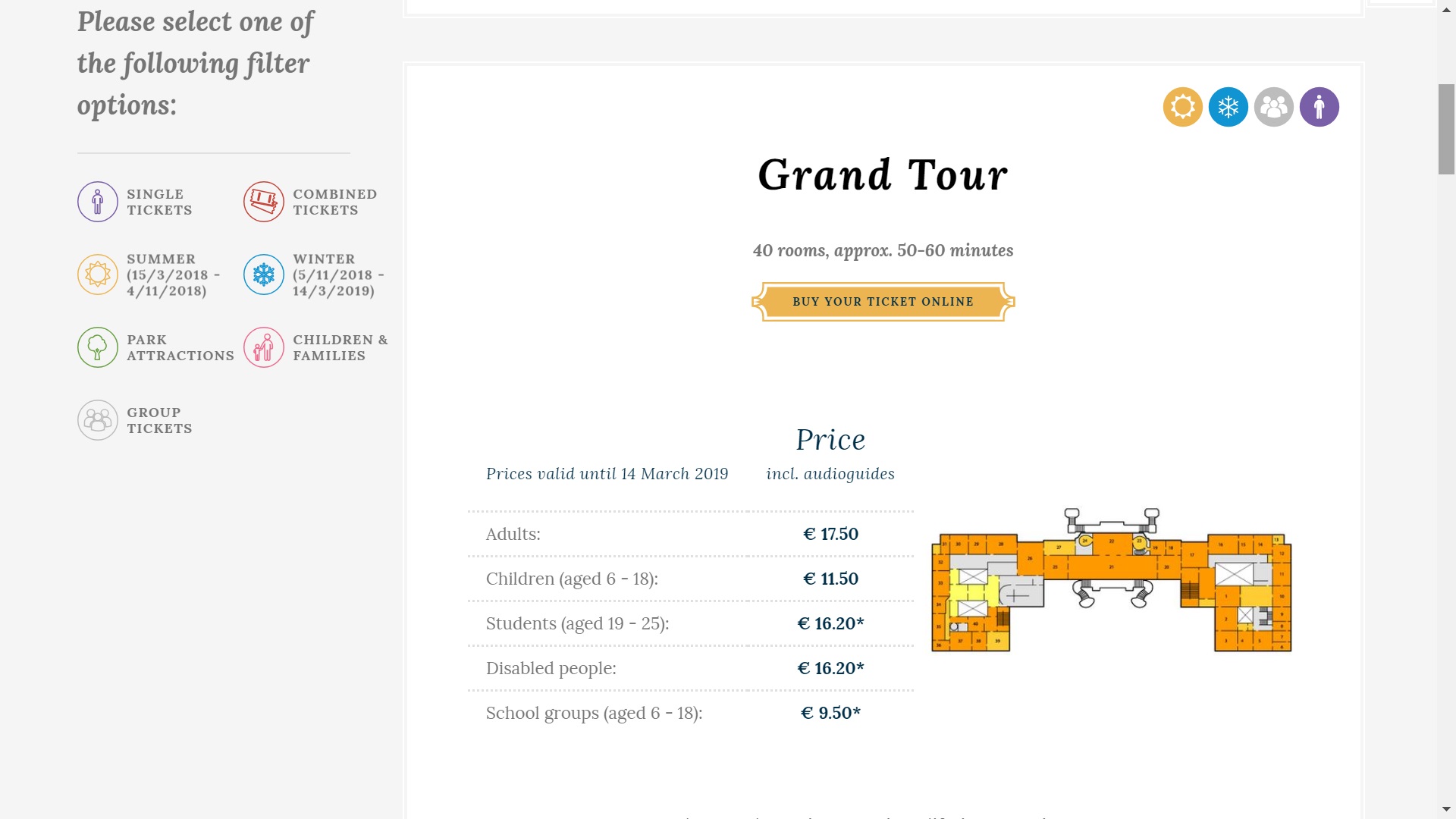 美泉宫和其他欧洲园林、庄园一样,分为皇宫 The House和花园 The Garden两部分,皇宫内各个房间的参观需要买票,花园后山上的凯旋门观景平台收费,花园部分免费。进来后可以结合自己的行程安排和喜好购买套票,可以在大厅里现场购票,也可以提前在网上买好