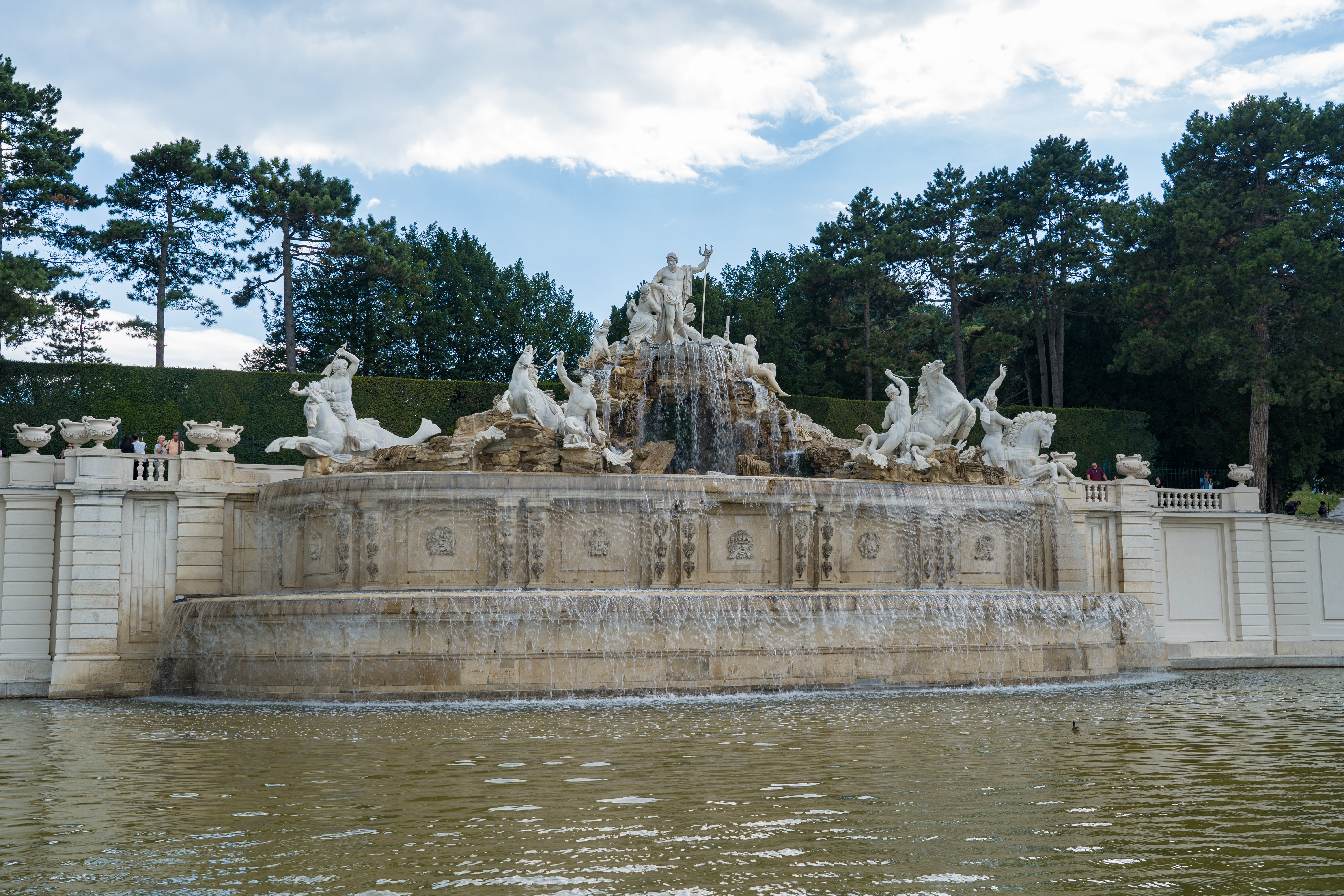 往美泉山的方向走,来到这座“海神泉 Neptunbrunnen”。1765年,奥地利早期古典主义的代表人和建筑师,约翰·费迪南德·赫岑多夫·冯·霍恩贝格,接手皇宫的艺术设计,他在山脚下挖掘并建造了这座喷泉,几百年的雕塑作品现在看来仍旧崭新如初啊!