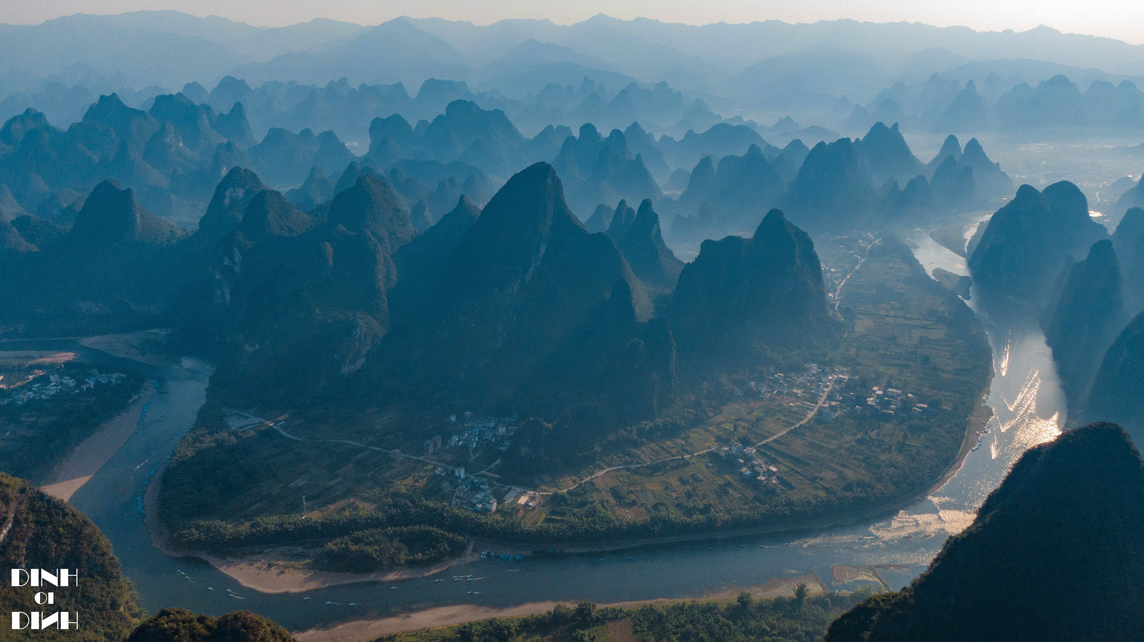 日头升起来后,游客才渐渐散去,这时候才敢掏出无人机来一个更高一点的上帝视角。这个时候,晨间的漓江 游船已经出发,右下角在晨光中划出一道道金色的凤凰。远处的群山在光影中时隐时现,美不胜收。