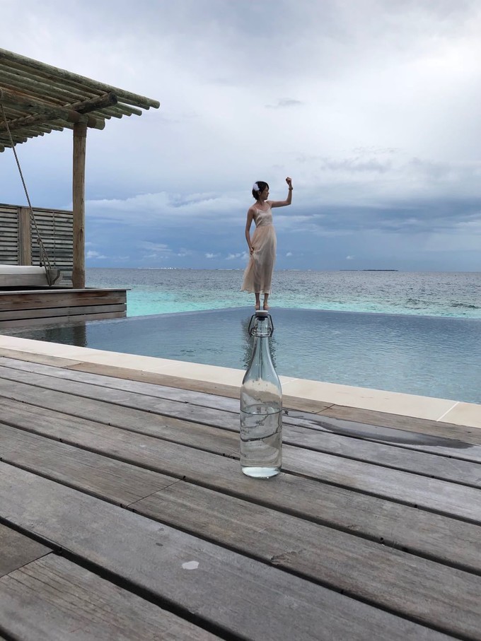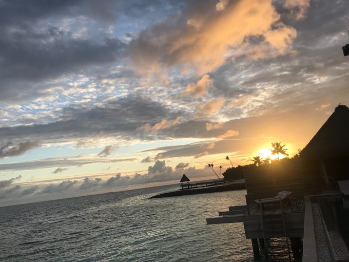 我居然最先介绍的是吃的,哈哈,果然是个吃货。我们入住的前两晚是泄湖豪华房,是半沙半水的房型,有300多平米,后两晚是水屋,200多平米,跟豪华房相比少一个客厅,其他没大差别,都是走出去就是大海,美是真美,完全不需滤镜,日出一般在7:10左右,最佳观日出的地方在婚礼草坪的凉亭;日落在19:10左右,最佳观日落的地方在Glow餐厅前的那个小酒吧。岛上一共121个房间,就是沙屋、半沙半水、水屋的区别,然后就是豪华房比基础房型多一个客厅,现在的价格刚好从前往后依次增加,管家告诉我们明年将反一反,因为老外更喜欢沙屋。
