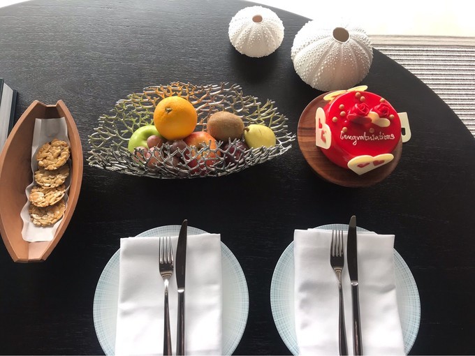 房间里的水、胶囊咖啡都是免费的,其他全部需要收费,详见价目表。房间外面有吊床、吊网、潜水用具是免费租用的。这里的沙滩与潜水都属于B级,彩色的小鱼不多,有朋友看到baby shar&turtle,我们看到了魔鬼鱼,适合潜水的地方在700号房间附近。不知道是房型的原因还是天气的原因,前两天没什么虫子,后两天苍蝇比较多,吃早餐时不停地在挥手赶虫子,蚊子倒是没有。房间每天早晚会各打扫两次,由于申请了蜜月福利,所以第一晚有个简单的Honey moon的布置,以及蜜月蛋糕和香槟(PS:那个蜜月蛋糕真心好吃呀),其他每晚打扫完都会放个小点心,每次逛完回来都有惊喜,特别开森。