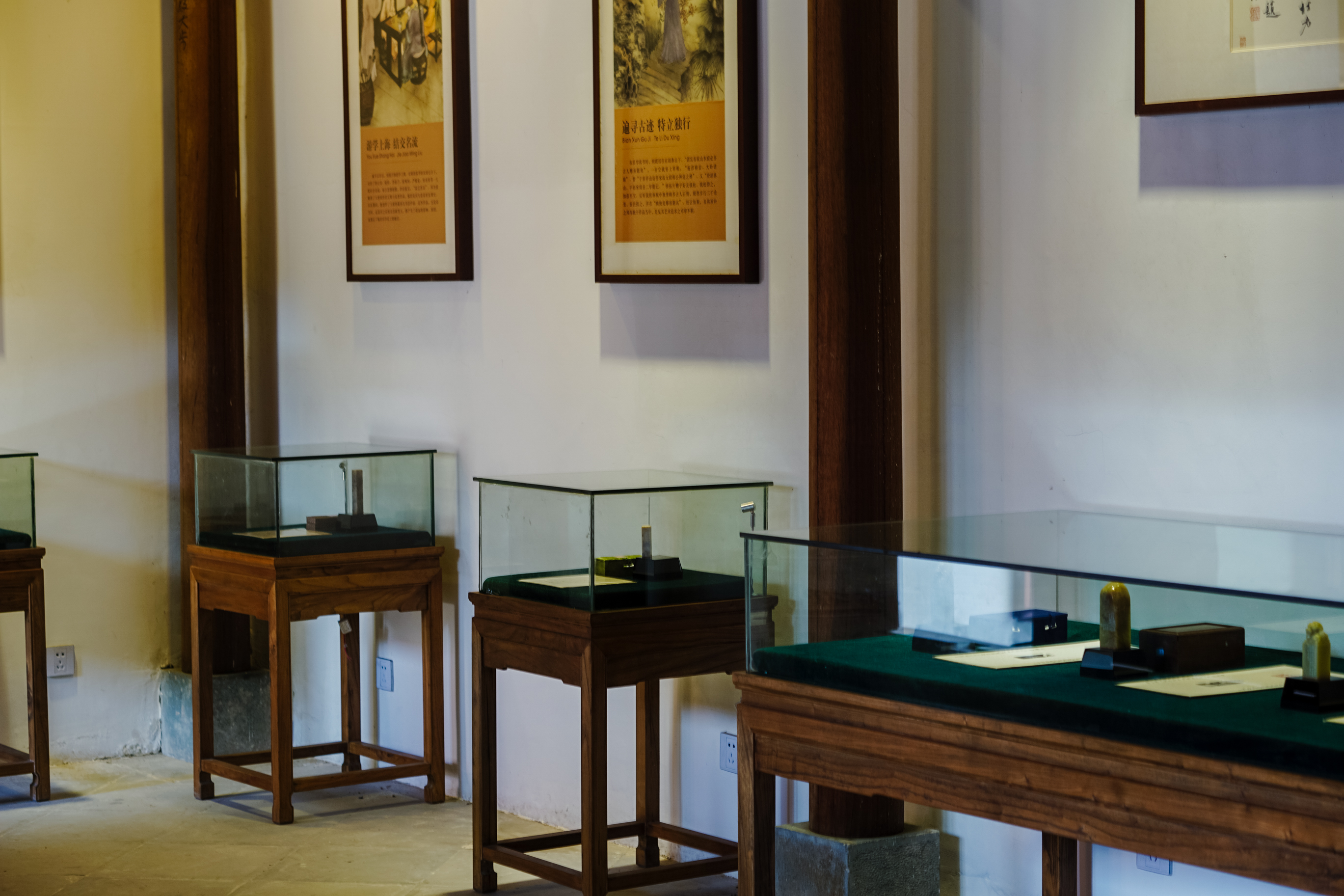 这里便是胡震纪念馆,胡震纪念馆占地3600余平方,其中建筑面积700余平方,周边环境幽美,小桥流水,自由游弋的观赏鱼、鲍贤伦老师的题字、展示西泠八大家及胡震篆刻作品的9方大印章,一楼6个篆刻文化陈列室和一个孝文化展厅,二楼为篆刻培训基地,在这里可以充分感受诸佳坞村的两大文化特色——孝文化和篆刻文化。