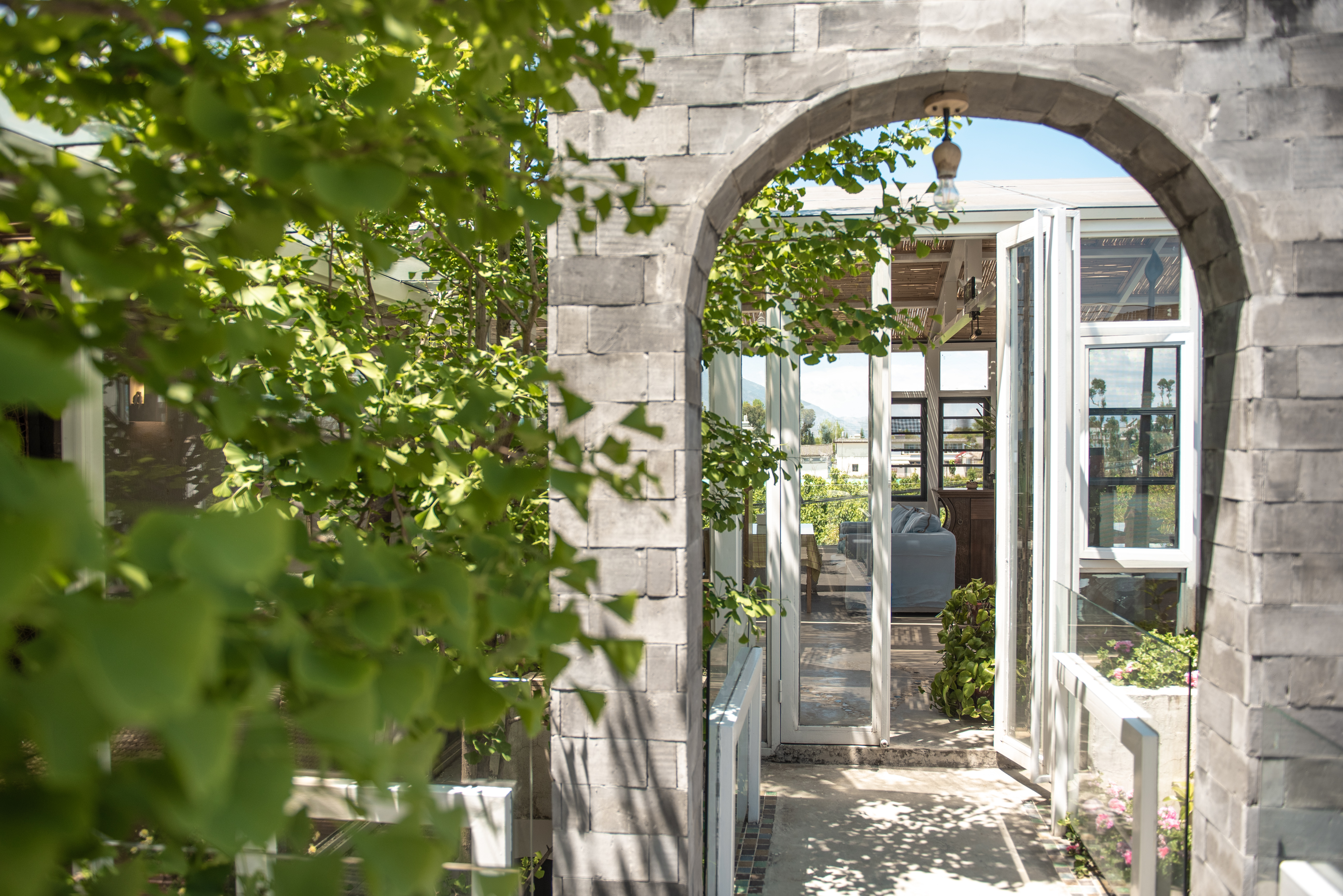 后院建有一个玻璃休闲区,落地的沙发,可以懒洋洋的在这里摊着晒晒太阳看看书打发一下午的时光,这里还是院子团宠喵星人桑桑的老巢,运气好还可以在这里撸撸喵。值得一提的是,玻璃房子被隔成了三个区域,就是因为原本这里种有一棵桃树,设计师不愿意将它砍掉,于是在玻璃房的中间留出一块露天的区域,给桃树生长。尊重自然尊重生命。