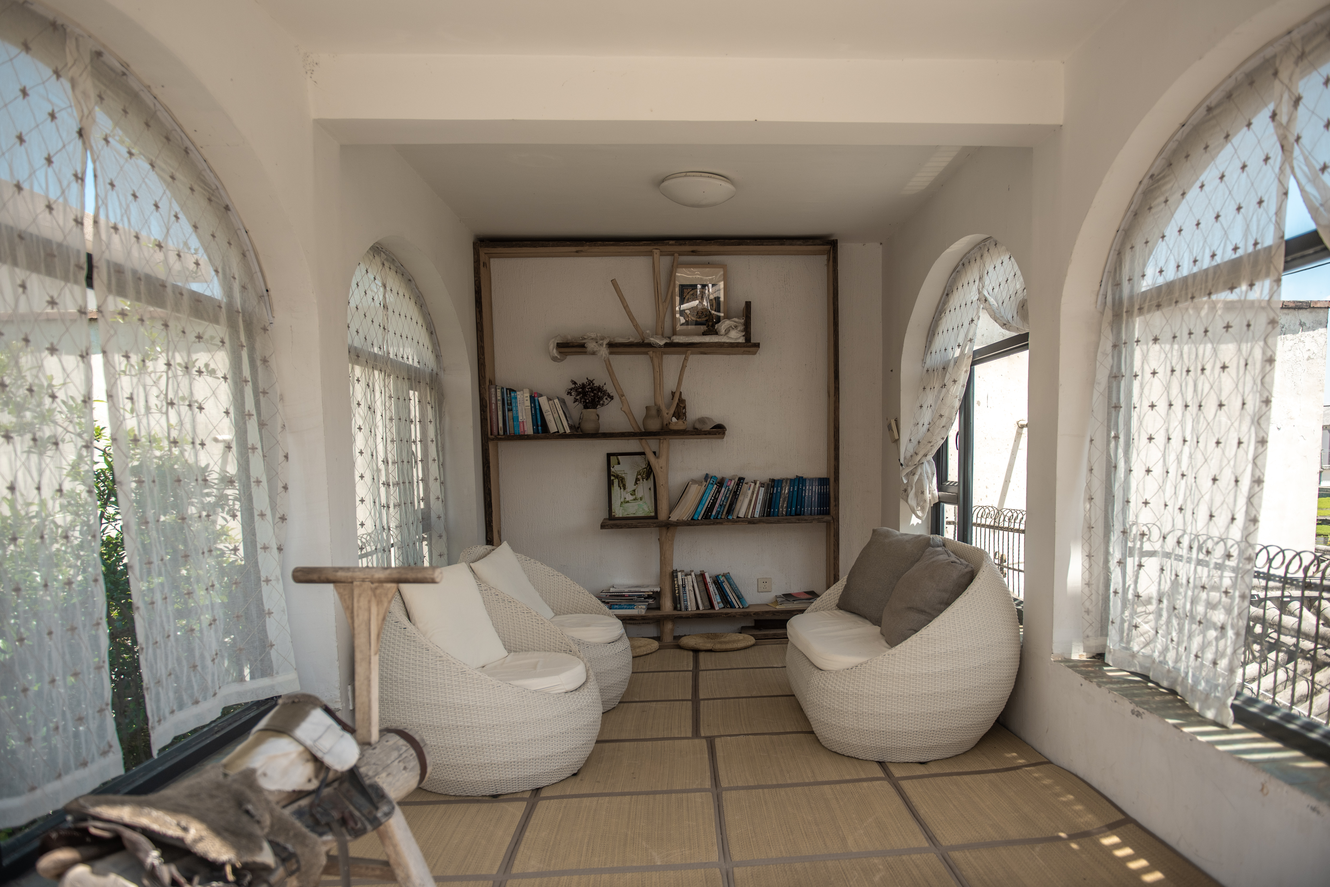 总共就是7间客房,除此之外还有一个大大的小花园+鱼池,一间书吧,一间小咖啡吧,整体的设计有些希腊的感觉,白墙+玻璃墙。民宿的主体建筑是当地白族的老房子重新改的,为了让房间更通透,做了一整面墙的玻璃,二楼房间的门口还有两棵银杏树,待到秋天,金黄的银杏树应该很漂亮吧。