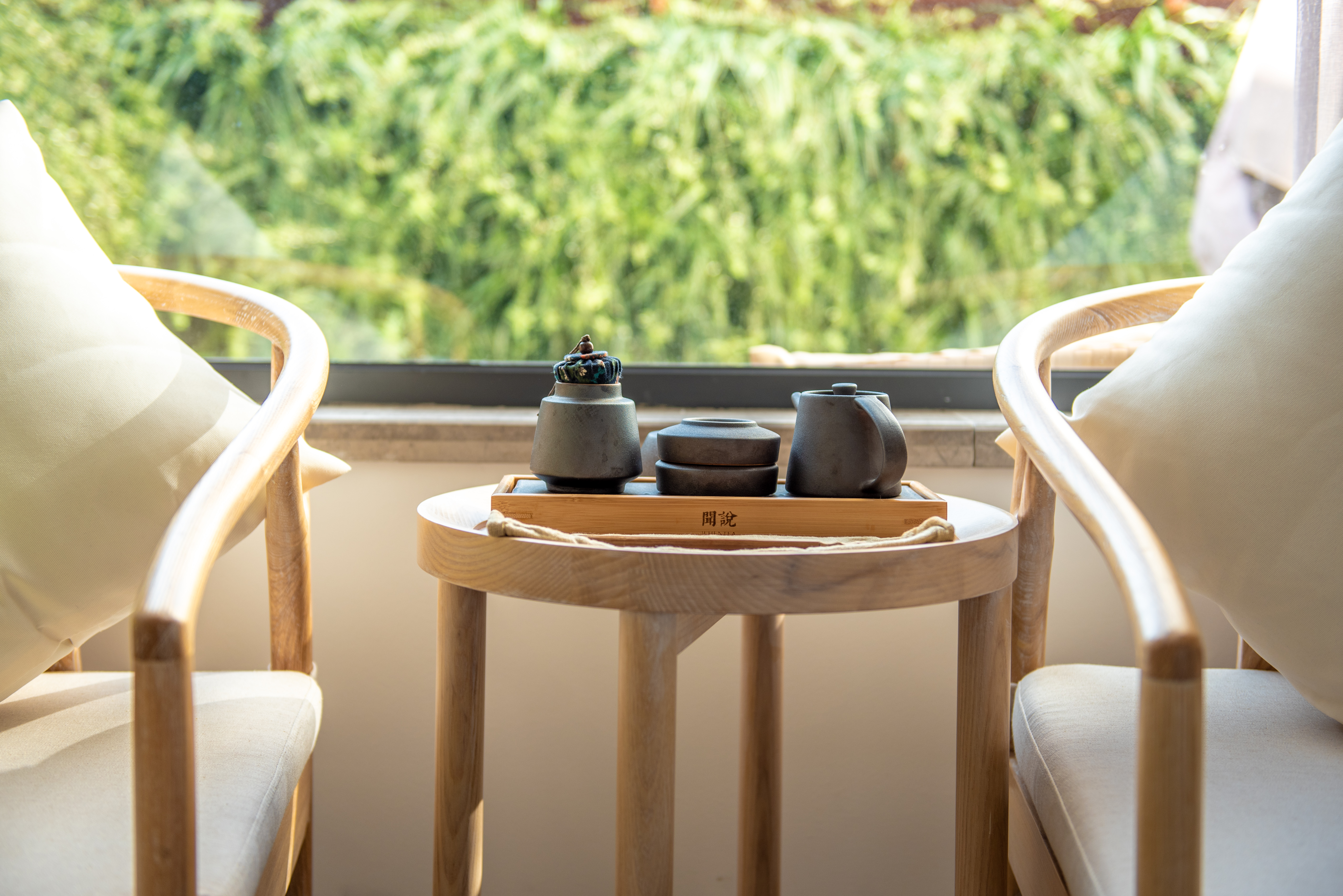 办好入住去房间的时候被中庭惊艳到了,名设计师的作品果然不一样。一个十字走廊连接着前院和后院,AB栋客房。剩下的地方就是鱼儿嬉戏的池塘。房门打开,第一印象就是宽敞,一个工作台把睡眠区和洗漱台隔开了。大片的镜子让房间更具通透感。超过两米的长沙发,躺在上面跟在床上一样舒服。