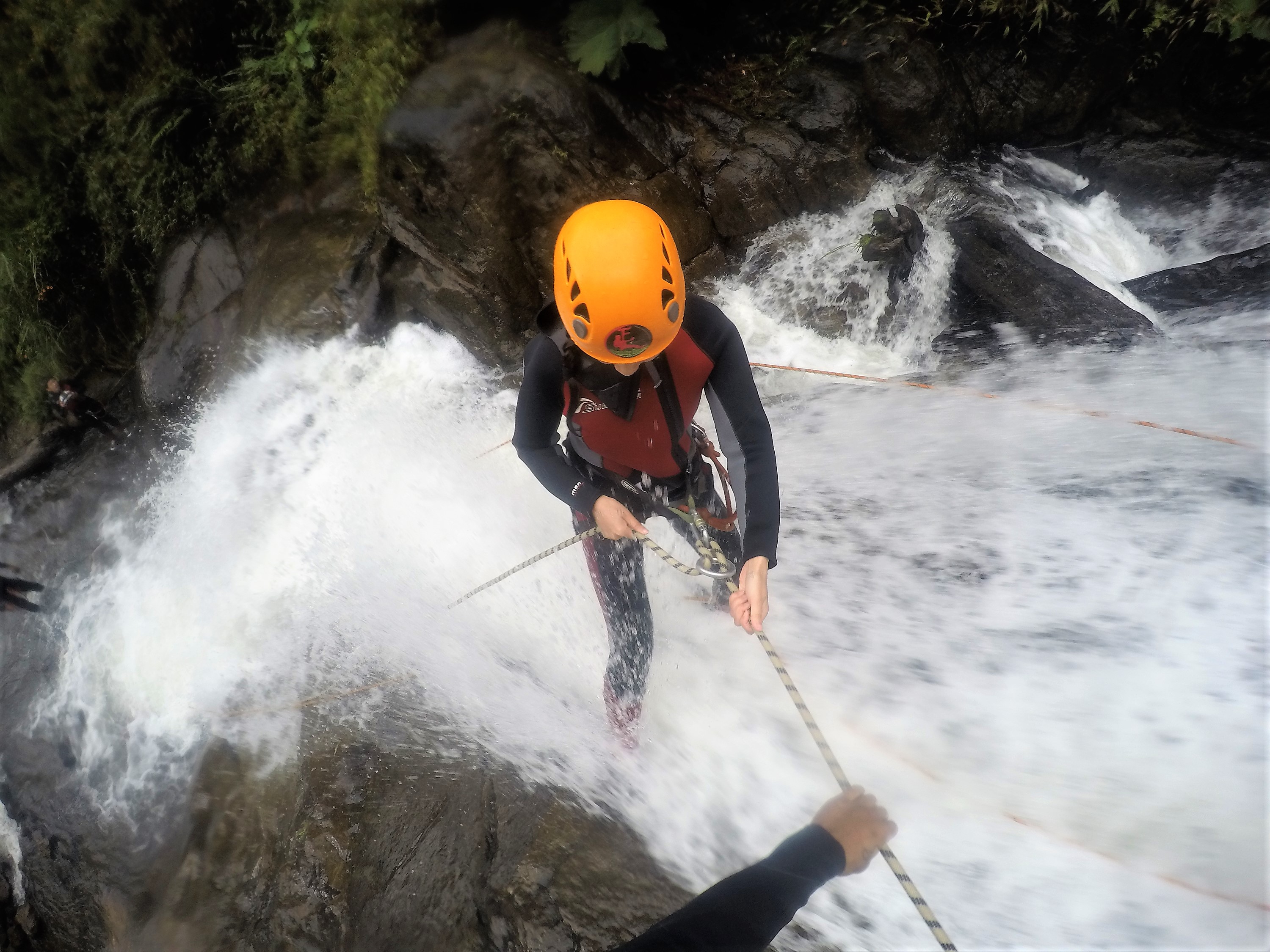 我玩过速降,却从没玩过瀑布速降。坐在瀑布之巅我的激动之情溢于言表,待下到瀑布里的时候才发现,瀑降是完全不一样的感觉。被瀑布常年冲刷的岩壁实在太滑,脚底根本踩不住,而从上奔流而下的瀑布水,根本不是花洒龙头出来的那种温柔,是急急躁躁扑扑满满地撞在脸上,眼前瞬间成了一片白色。