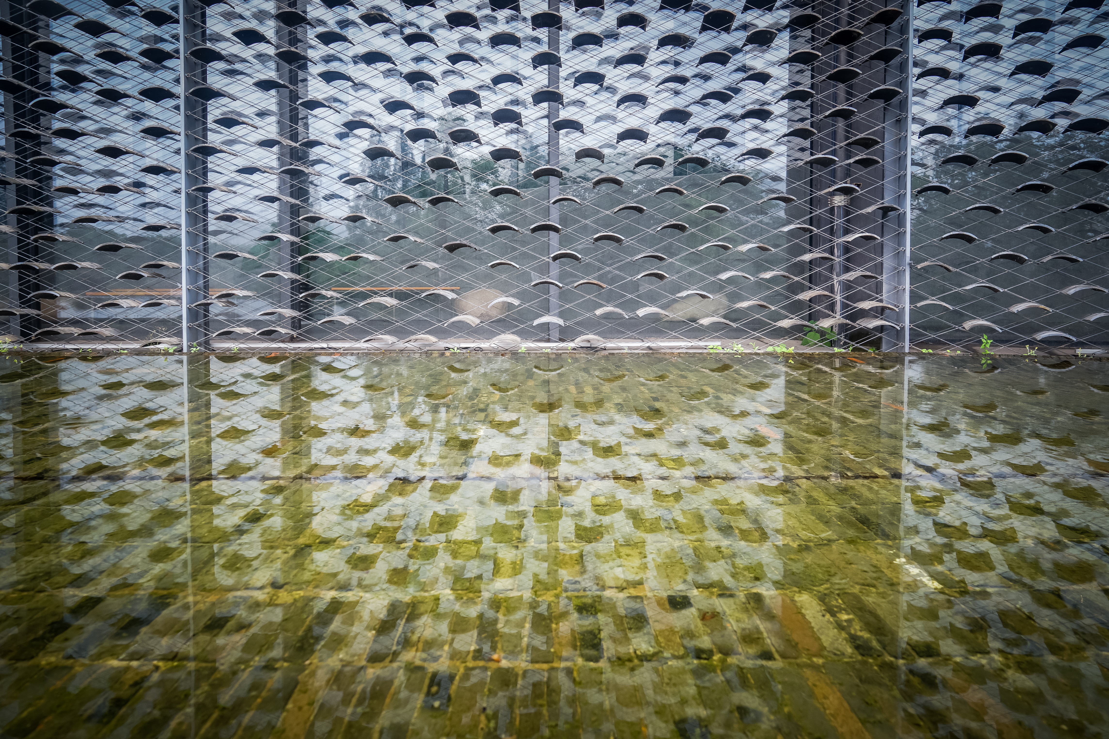 博物馆的立面是建筑最有特色的设计之一,隈研吾用灰瓦来作墙面装饰材料,通过钢丝编织而成的网,一块块的灰瓦与钢丝网形成非常柔和的半通透墙面。如果赶上晴天,阳光流入室内,不同的时段会有不一样的光影效果。