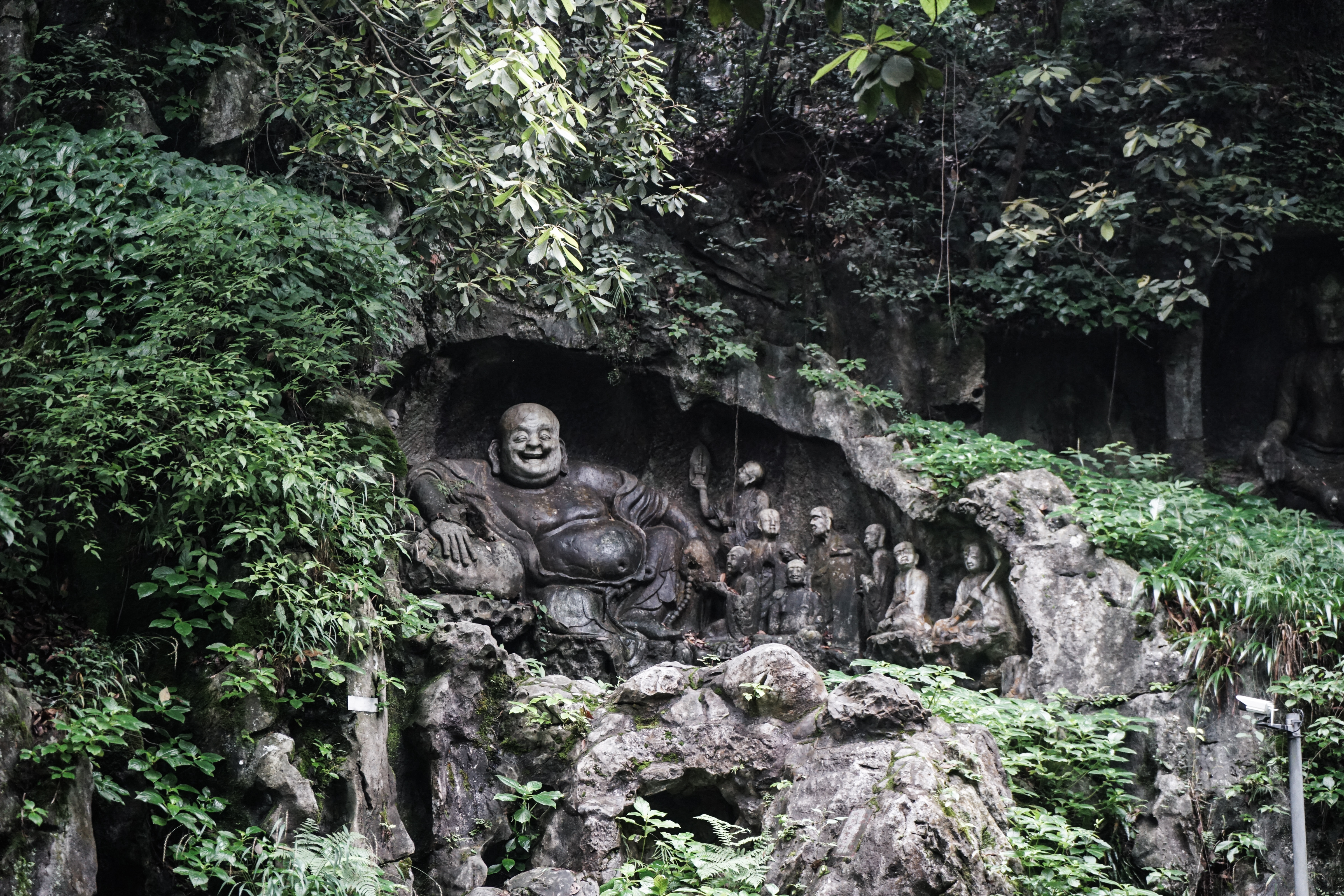 这里最有代表性的就是大肚弥勒和18罗汉群像,此为飞来峰摩崖石刻中最大的造像,也是国内最早的大肚弥勒造像。佛像雕刻生动传神,坐于佛龛中的大肚弥勒坦跣足屈膝,手持数珠,袒胸鼓腹而开怀大笑,将“容天下难容事,笑天下可笑之人”的形象刻画得淋漓尽致。