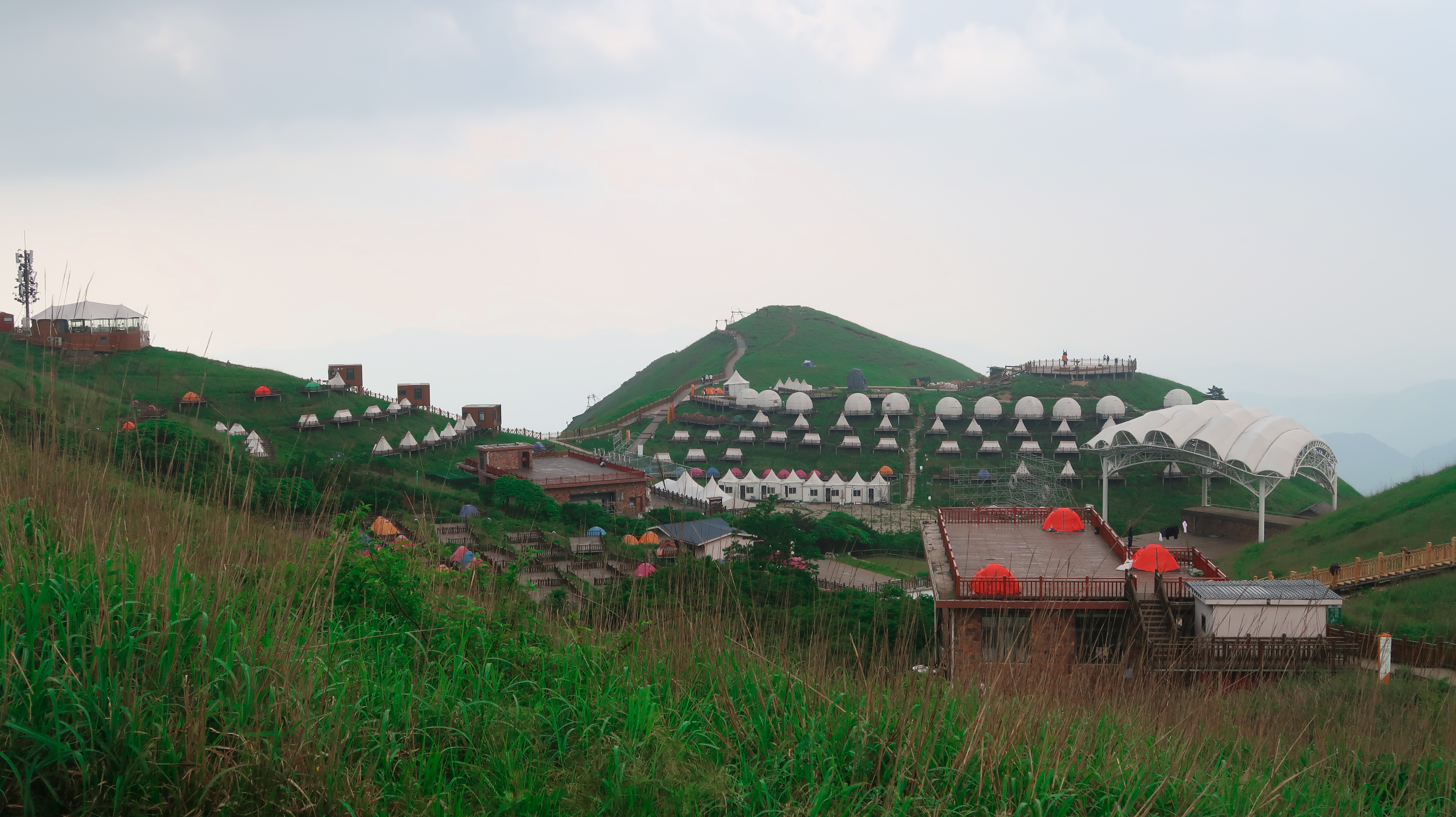 我们休息了一会,又继续登山,当我们来到了山顶的栈道,远处密密麻麻的帐篷和“蒙古包”,满眼绿油油的草甸一望无际,仿佛自己置身于天上草原之中。正如宋代诗人郑强登武功山说的一样:“绿色青黛梁群山。”