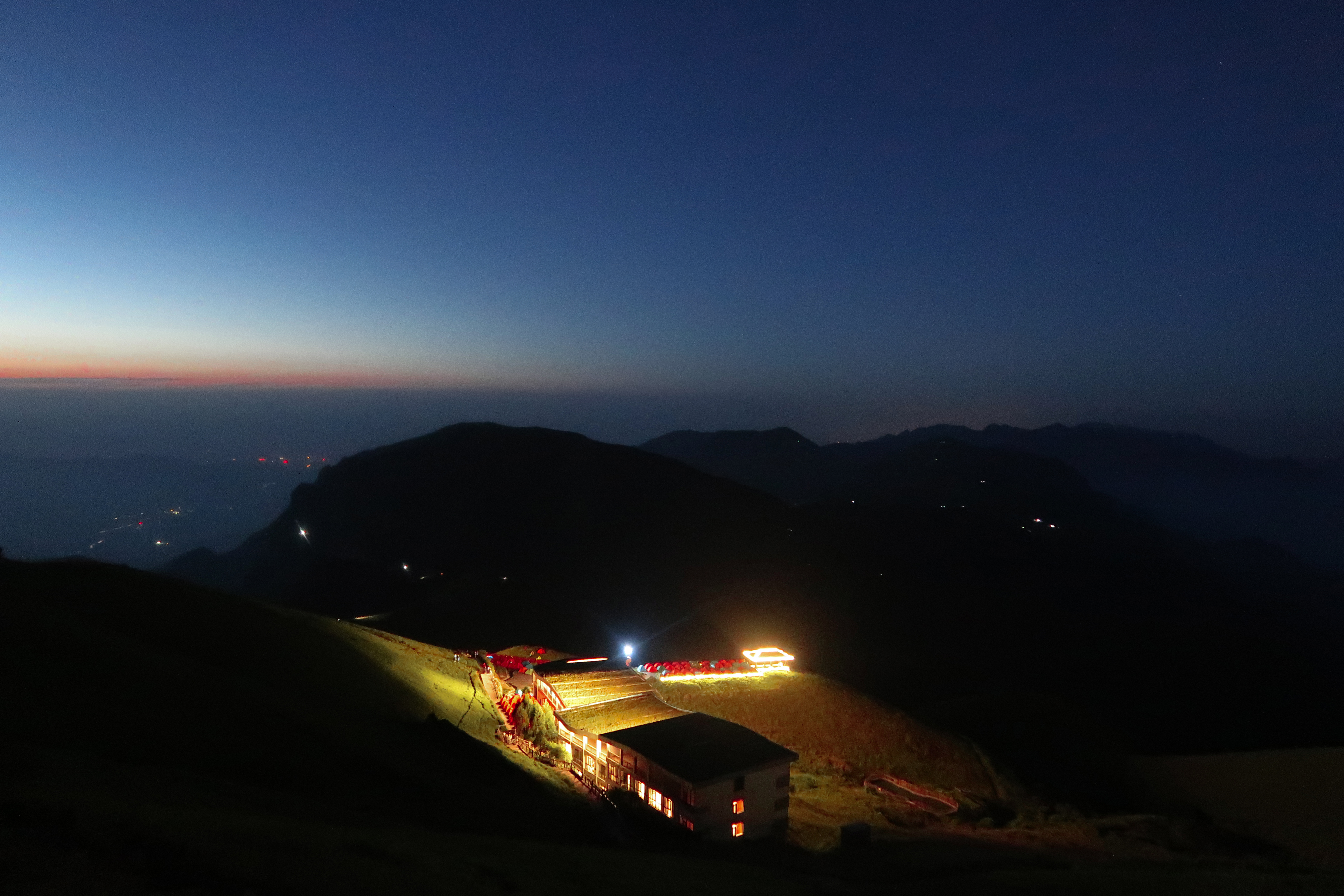 到达金顶驿站后PP领队开始安排住宿,山上没有宾馆,住的是小木屋,木屋一排连着一排,一间挨着一间,在山凹中排列开来,形成武功山上又一道独特的景观。我们住的是四人间,上下铺的木床,我选的是上铺,床前面是一整片天窗,躺在床上可以看见日落日出,视野非常棒。