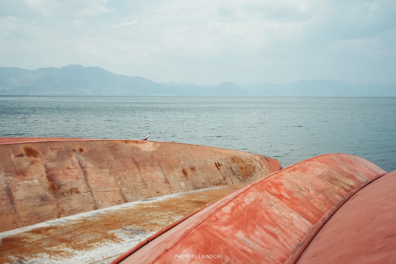 这里位于抚仙湖樱花谷沙滩公园附近,没有名字,沿湖顺时针一段时间,从公路边的一条小路下去约几十米,就能看到一排排铜色铁质渔船,非常出片。