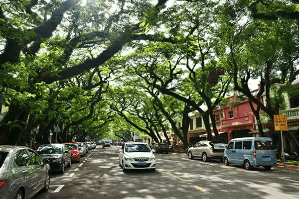初见中原,大为惊艳的不仅仅是路旁五彩的房屋,更是这一片雨树,如伞状的树冠郁郁葱葱,伟岸的树干铺满了一种绿色的寄生物,远远看去犹如一道绿色的大拱门,人流和车辆在门内川流不息,据说,这种雨树是当地华侨1982年从南洋引种回来的。