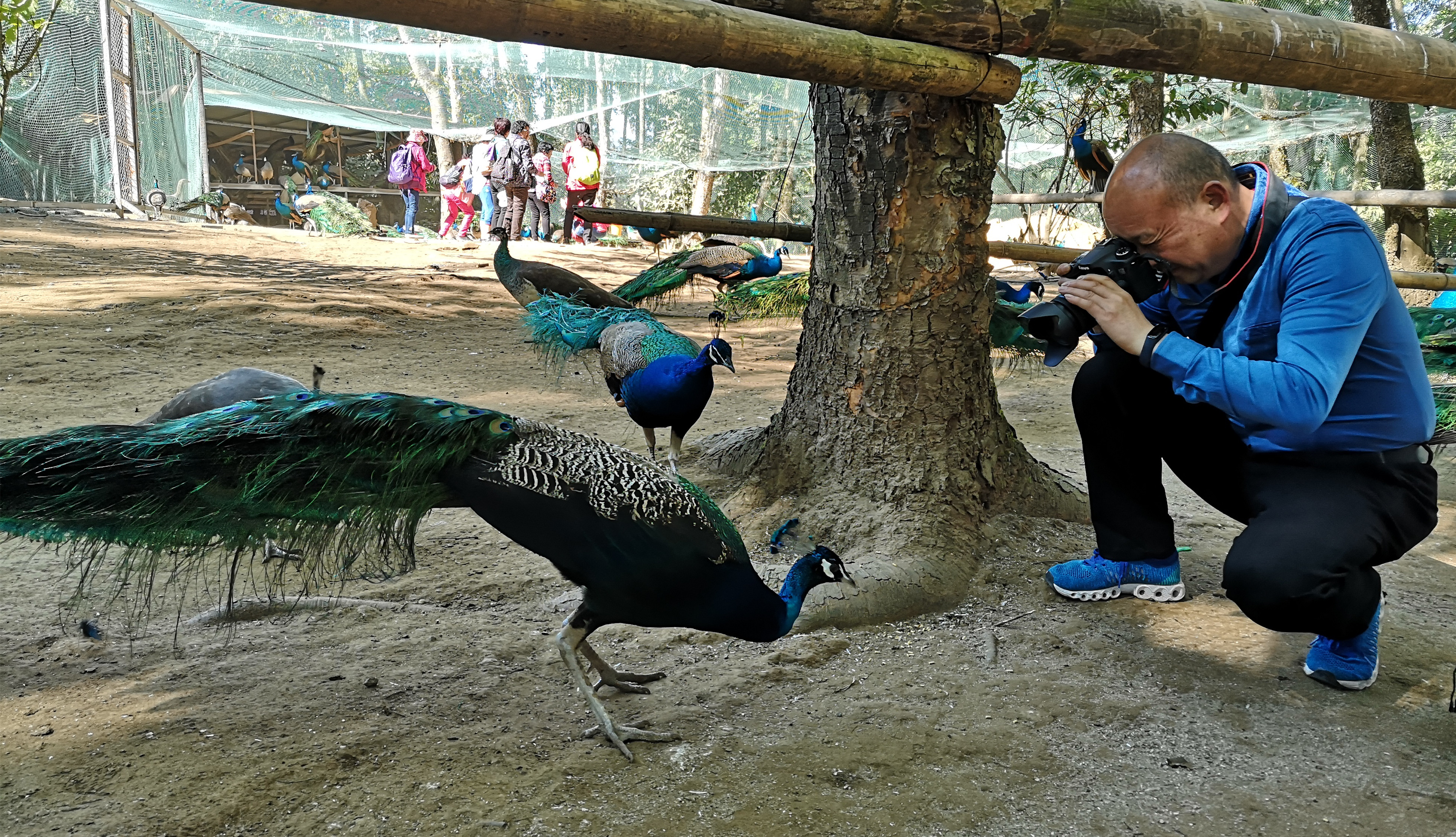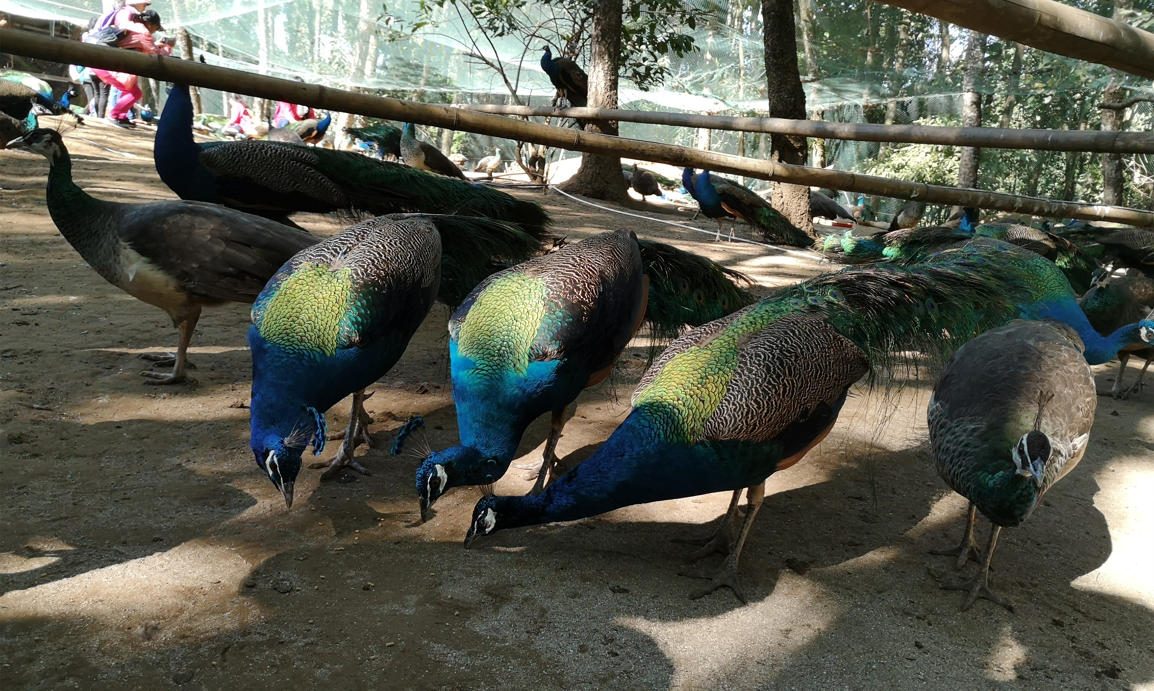 这里有圈养和散养的孔雀,由于见惯了每天来来往往的人类,它们很少有兴奋感,懒懒的闲庭信步,懒懒的抖动羽毛。大多游客会买来饲料亲手喂孔雀,顺便和孔雀合影。偶尔看到孔雀开屏,游客们依然会爆发一阵惊呼。