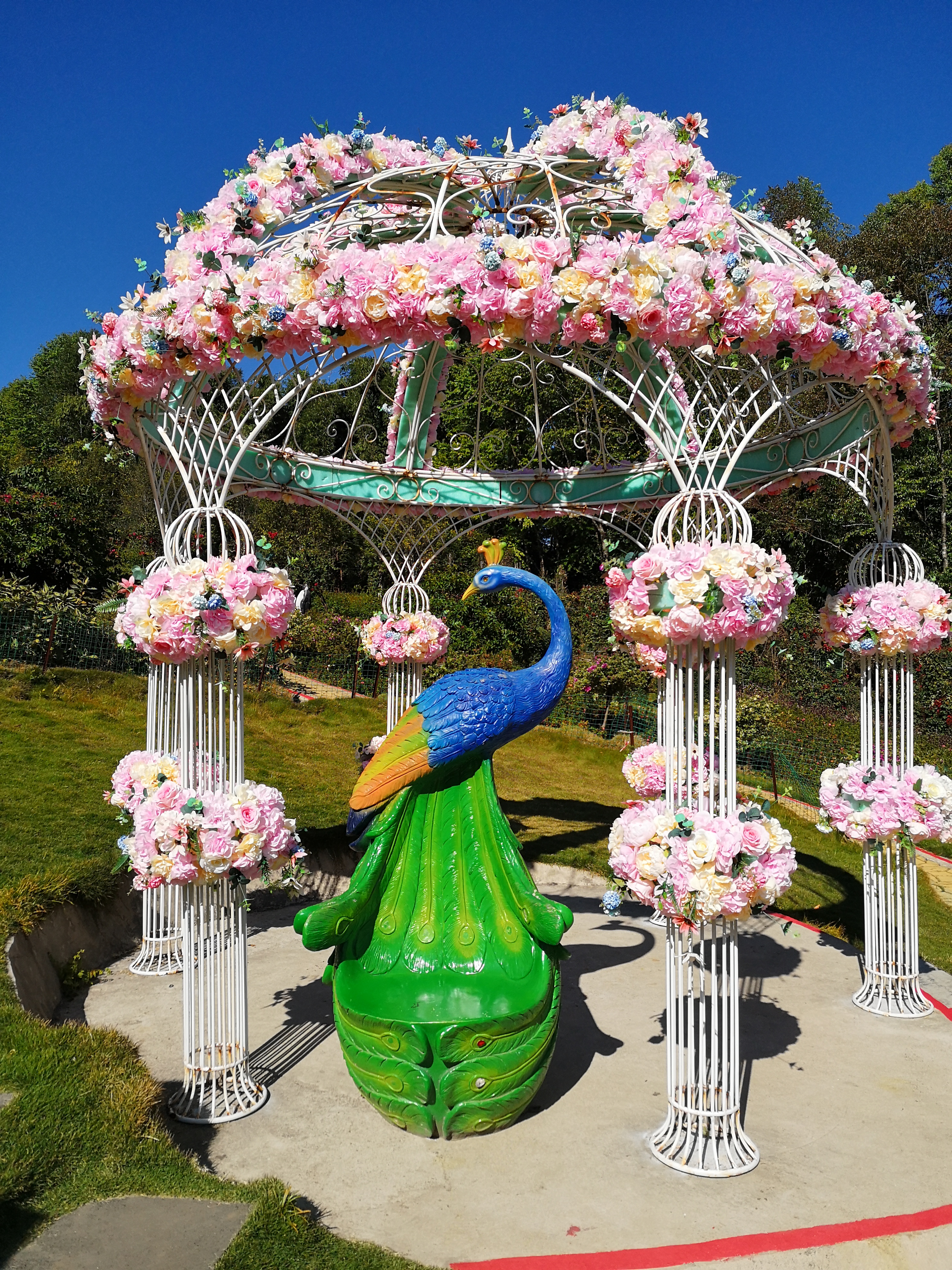 在巨型孔雀周围散布着形态各异的孔雀家族成员,不同鲜花搭配使得孔雀犹如花中精灵。它把花的芳香和孔雀的美丽融为一体,有美丽,吉祥,和谐之含义。