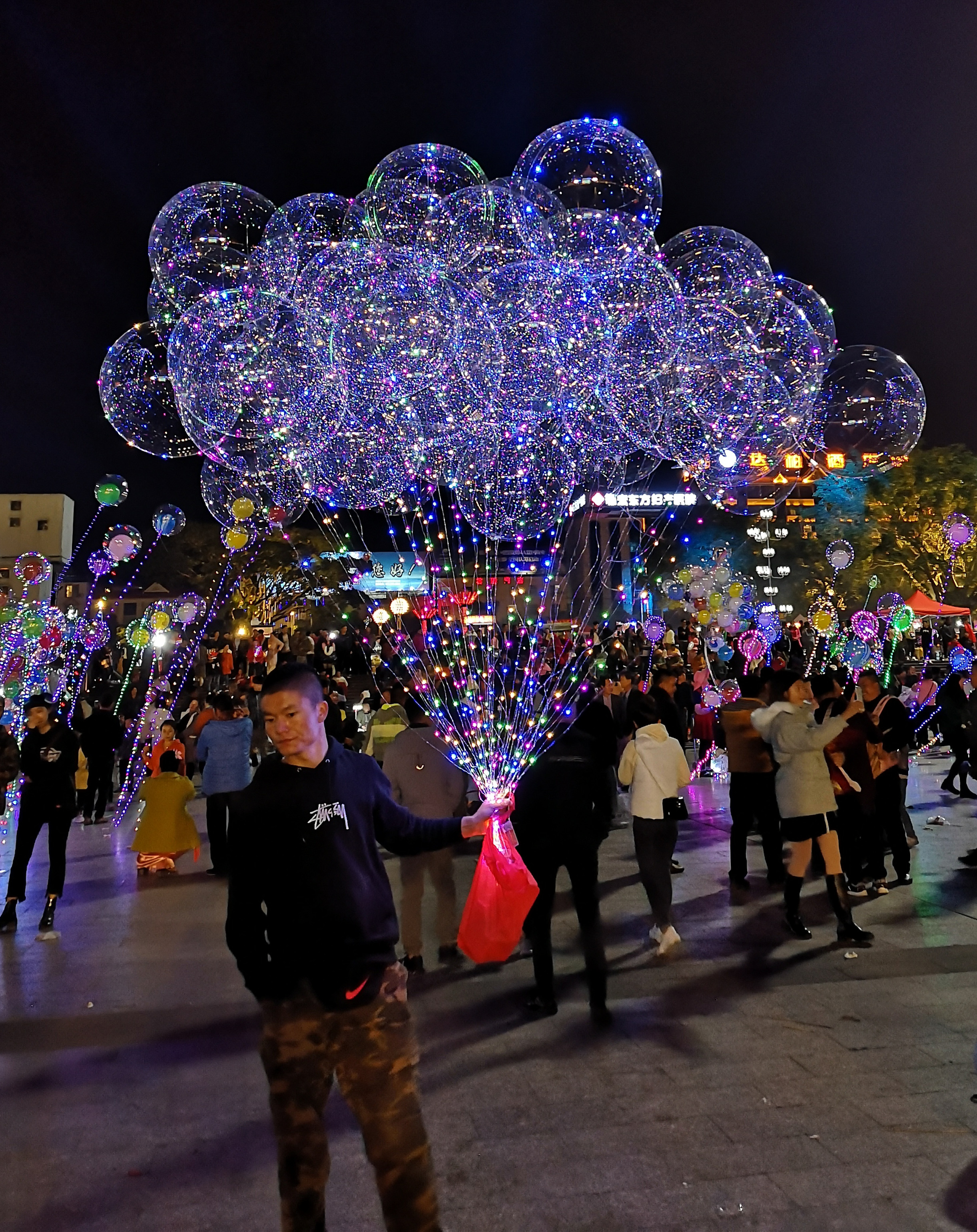 广场上各式小贩或见缝插针地摆摊,什么西瓜灯、糖葫芦、棉花糖、日用品等琳琅满目,或游走于摩肩接踵的人流之中,叫卖着炫彩的气球,孩子们欢快地跑来跑去,年轻的小夫妻用手机甜蜜地在拍着合影……和平盛世的和谐之景映入眼帘。