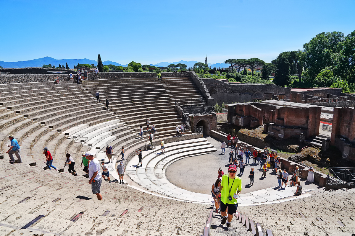 在 庞贝 城的东南角,有两座露天剧场,依坡而建,形成层层的看台。一座大剧场用来演出喜剧和悲剧的戏剧,另一座是小剧场,用来表演更贴近内心一点音乐或朗读。 庞贝 当时不仅歌舞升平,更是人丁兴旺,据说这个剧院可容纳下成千上万观众。哈哈,这两位是对着历史书来看现场吧!