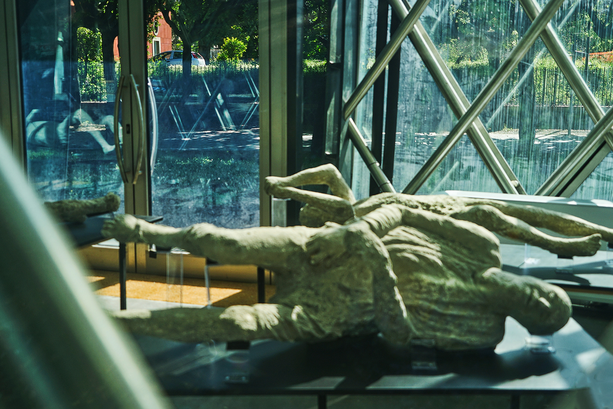 庞贝 古物馆收藏着一类特殊的藏品,那就是考古学家依据出土的人体硬壳制作的人体塑像。在火山喷发的一刹那,无数的受害者在火山浮石、毒气、火山灰的夹击中丧生。火山灰包裹了他们的躯体,凝固了他们最后的姿势,将 庞贝 人临终前的各种细节都记录了下来。这些人死时大多和他们的财产在一起,有些死难者则手里握有神像,说明他们在危难时没有忘记向神灵求救。虽然这些人已经逝去近2000年,仍能给如今每一个来到这里的人以极大的震撼。