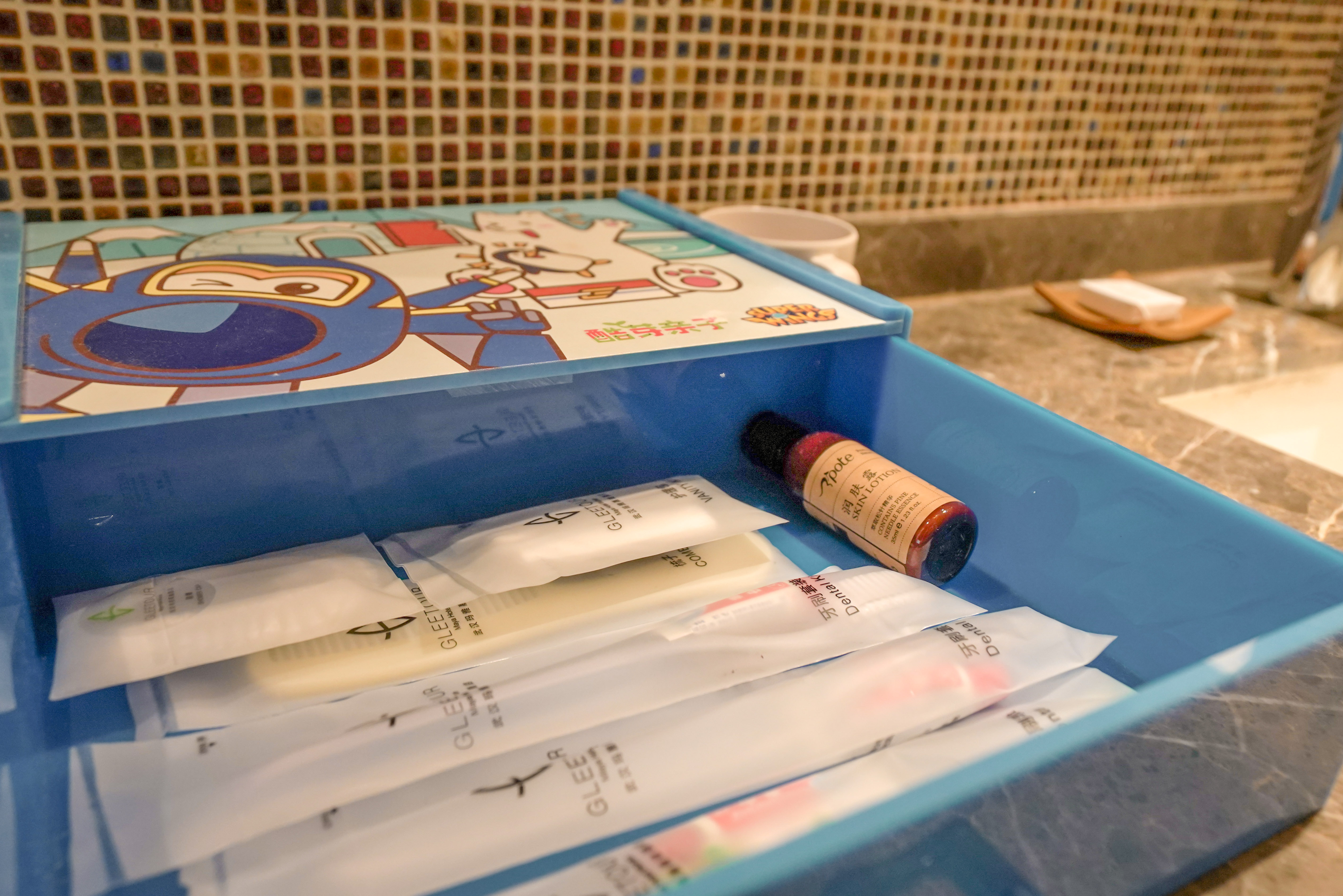 我还发现酒店的一大亮点,酒店处处都体现着对小朋友的关爱,最特色的要数设置了很多不同主题的亲子套房,无论是男孩还是女孩都能找到心头爱。从硬件的卡通床品、小帐篷、小木马、儿童花洒到细节的小拖鞋、儿童牙刷、儿童浴袍等,处处都为小客人们想的十分周到,就连小冰箱里都是惊喜,四种不同的饮料和小糕点,都是免费提供的。