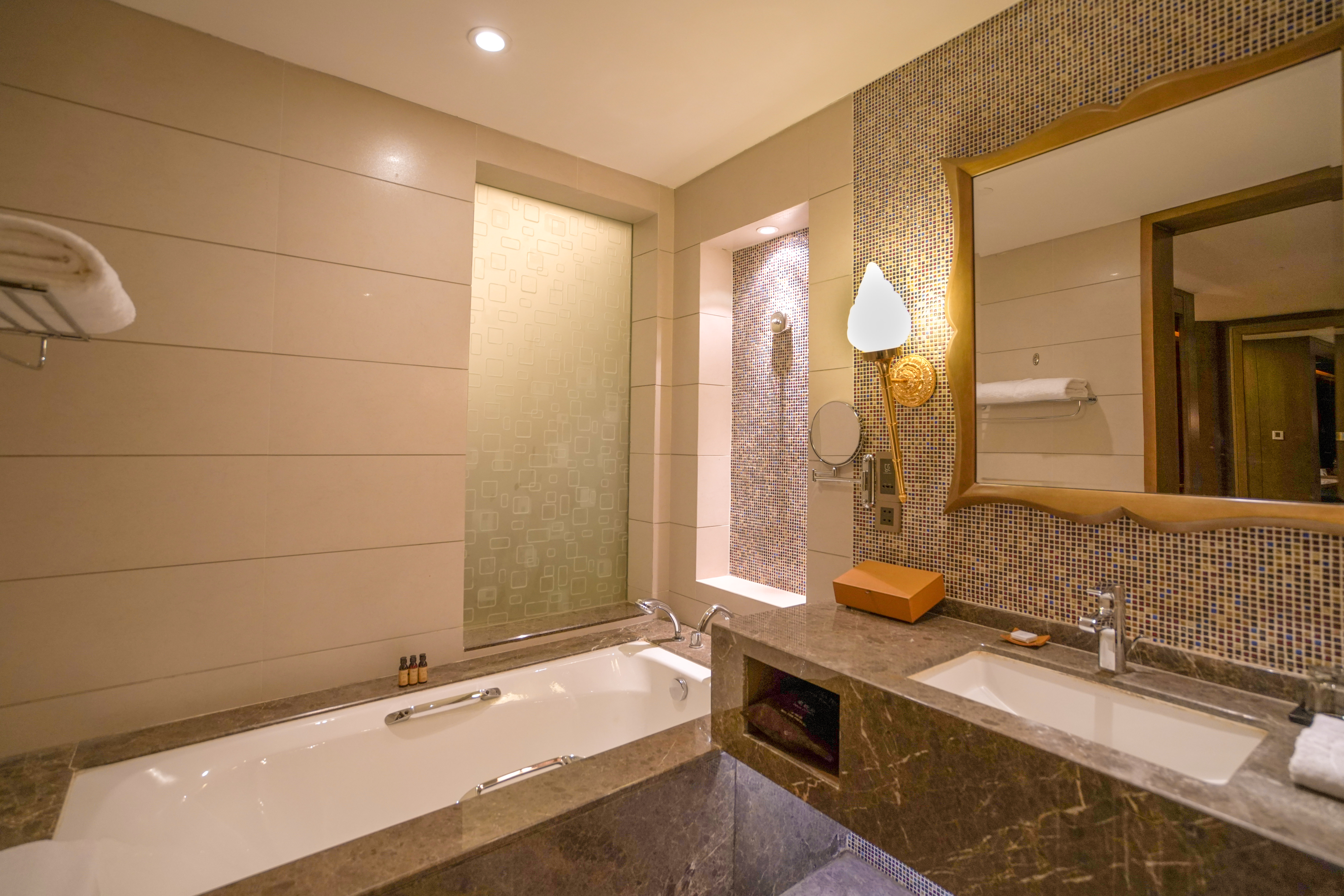 入住45平米的豪华园景客房,入住前服务员已经提前插好房卡,暖气开得足足的。入门有一个隔断,将洗簌区和住宿区完美的分开啦。房间内有两扇落地门窗,采光非常好,并设有独立的办公区和休息区,在沙发边上放着洗净的欢迎水果。近两米的大床上布置着花瓣和欢迎卡片。看到这样的布置,心情立马放松下来,一路舟车劳顿的疲惫也消减大半。
