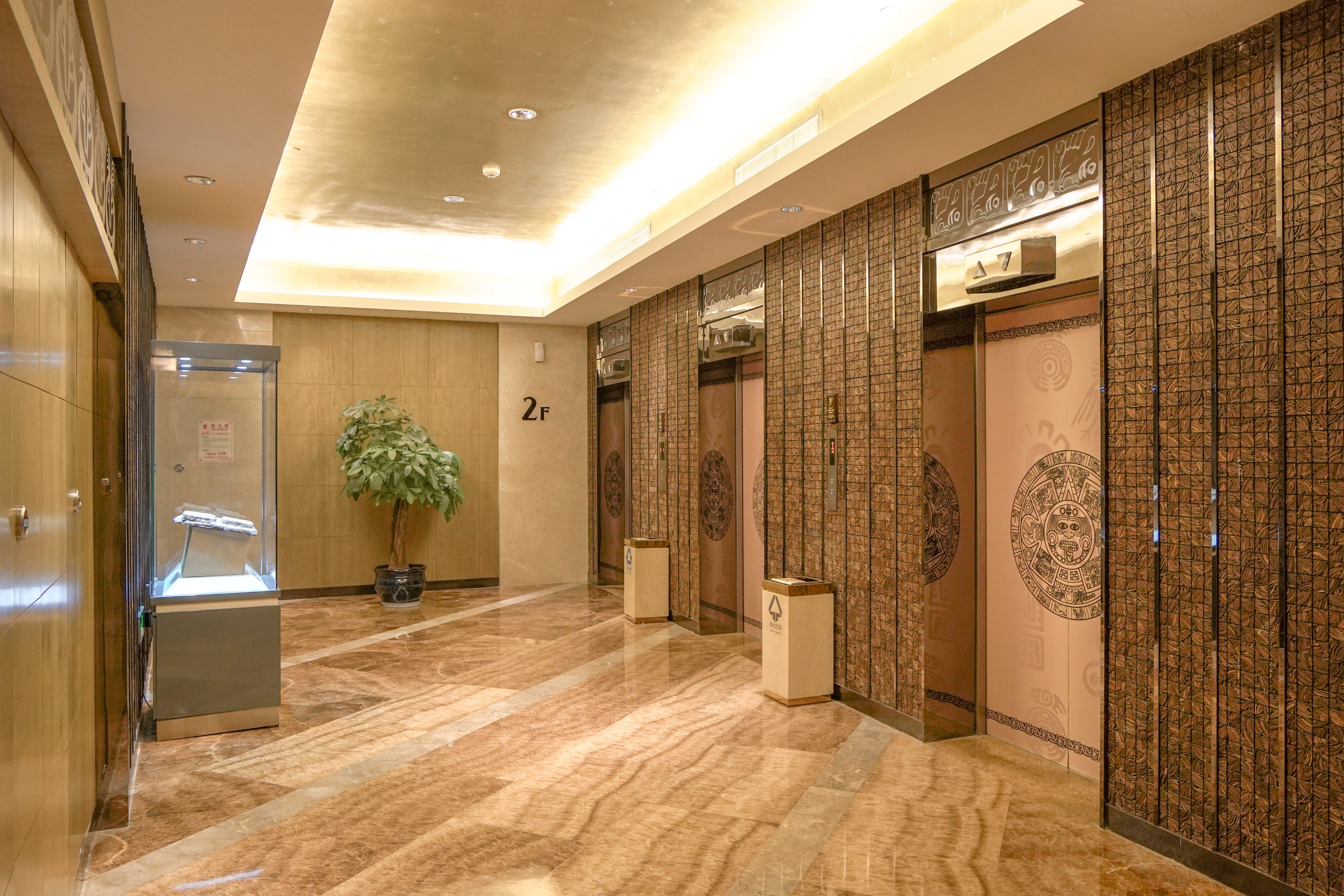 在酒店里处处能看到玛雅元素,酒店每一层电梯口及一楼大厅都陈列着玛雅文物的复刻品,有些会带着简介,像大家都知道的金字塔、雨蛇神、水晶头骨...这些神秘且至今未能解开其奥秘的物件,在酒店内随处可见,电梯、地毯、门框、甚至是杯垫都带着玛雅的元素,整座酒店像是一个玛雅文化展览,等着你去发现。