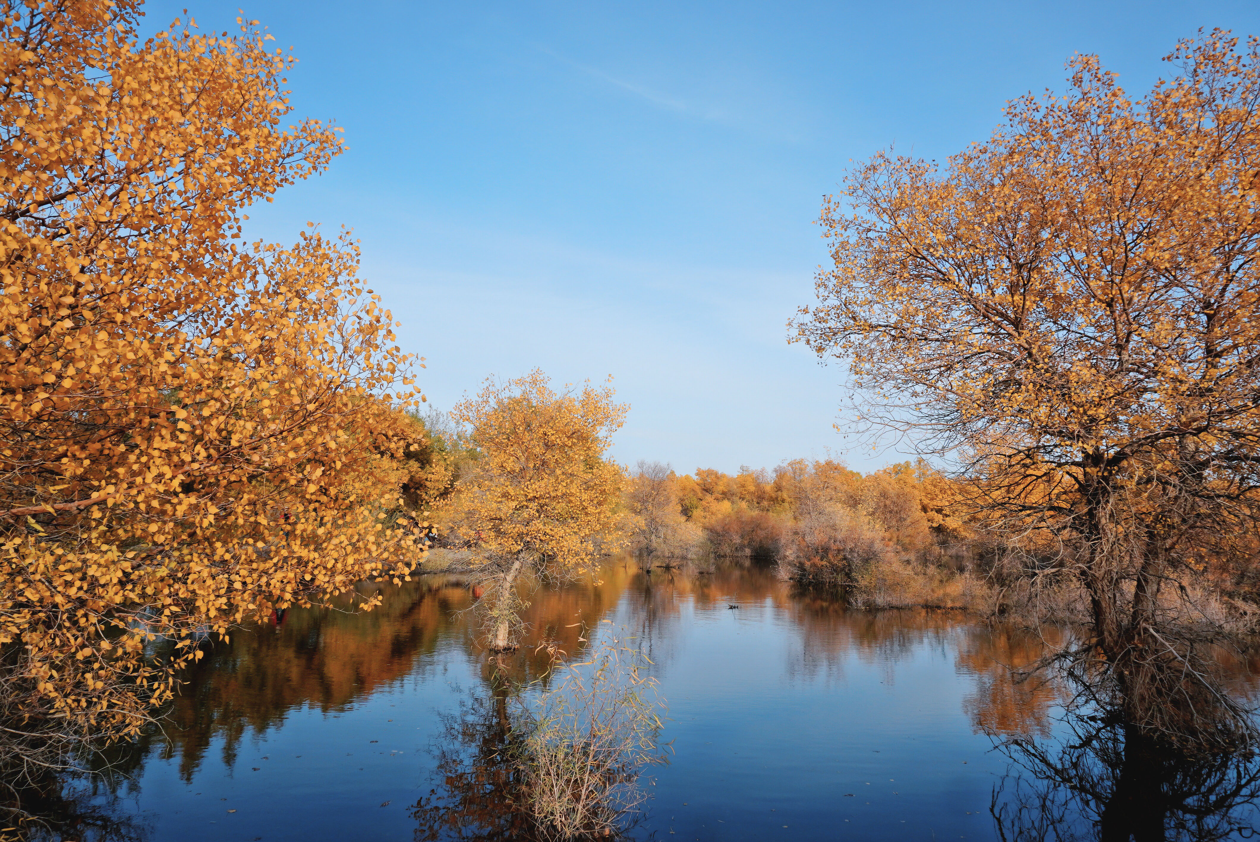 金塔胡杨林其独特之处在于傍水而生,在一池碧水的掩映下,胡杨林如同一把把火炬,闪烁着耀眼的金光。