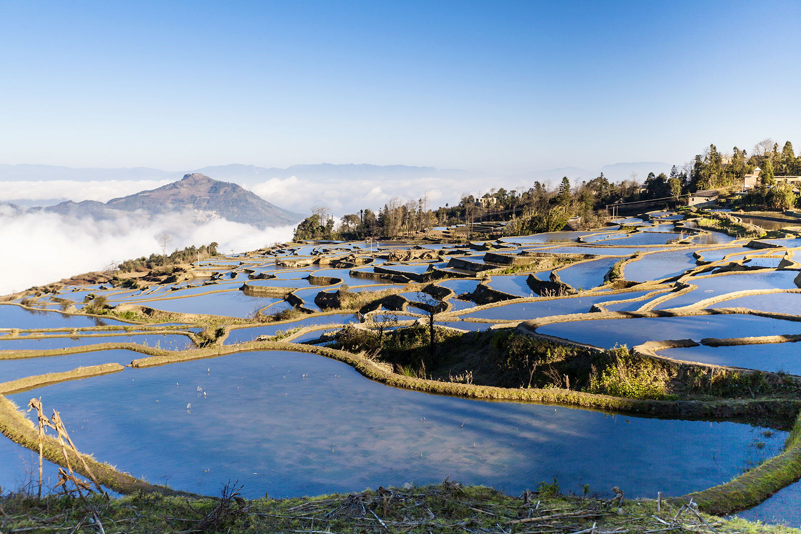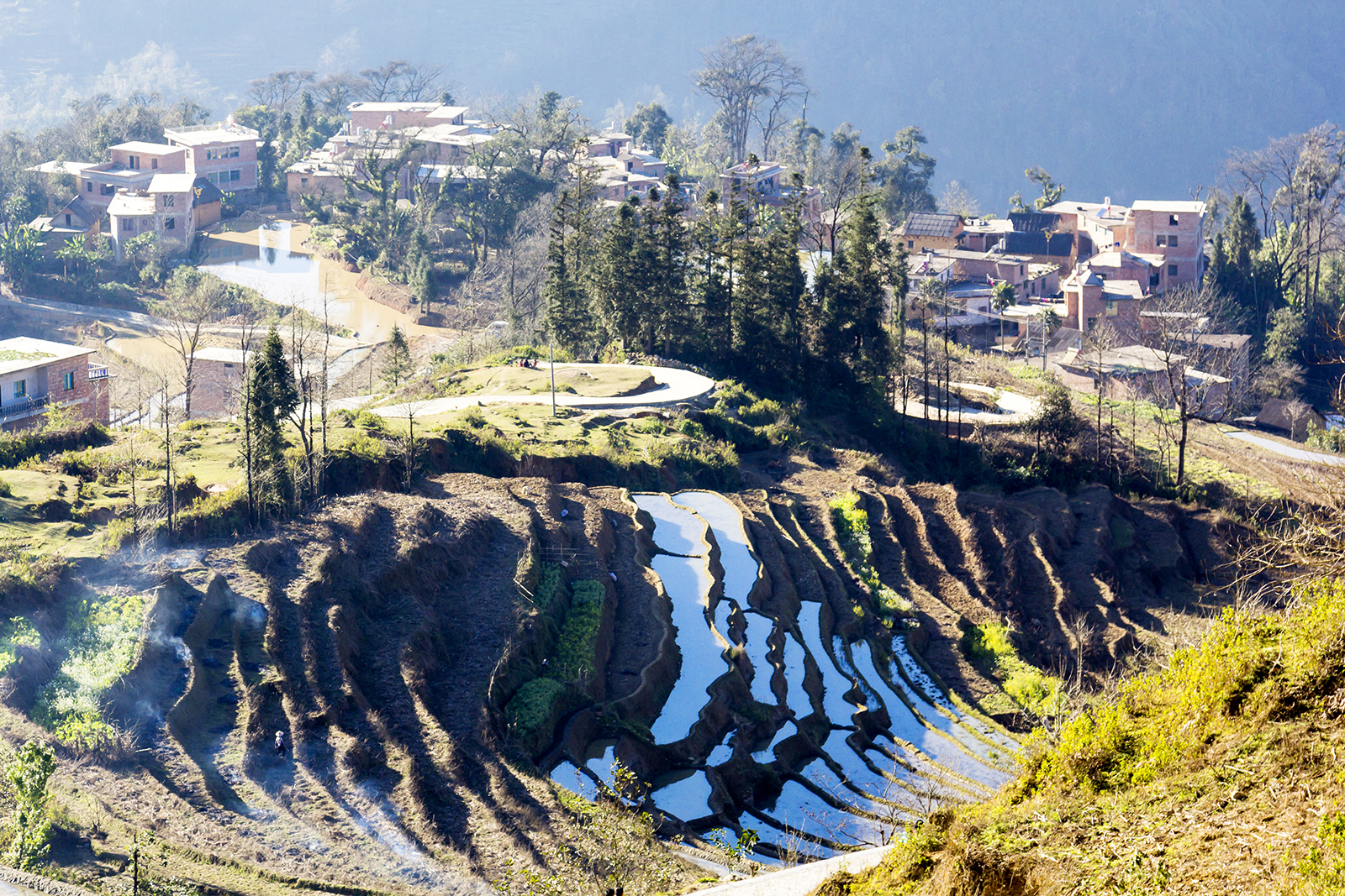 观景台,并不是景点很正式的那种观景台,就是村里用水泥铺成的一个平台。从平台上望出去。梯田从两侧由高向低一层层向中间延伸,形成一个凹形。梯田里也灌满了水,水的颜色随着观看位置的变化,一会儿是纯粹的淡蓝色,一会儿蓝色中带上土黄色,一会儿土黄色又变成了隐隐的绿色。凹形的梯田,像水槽一样向外伸展下去,很快就消失在远端山谷中,好像那里是一道陡峭的崖壁。山谷中虽然还有雾气,但已经在阳光的照射下显得越来越稀薄。