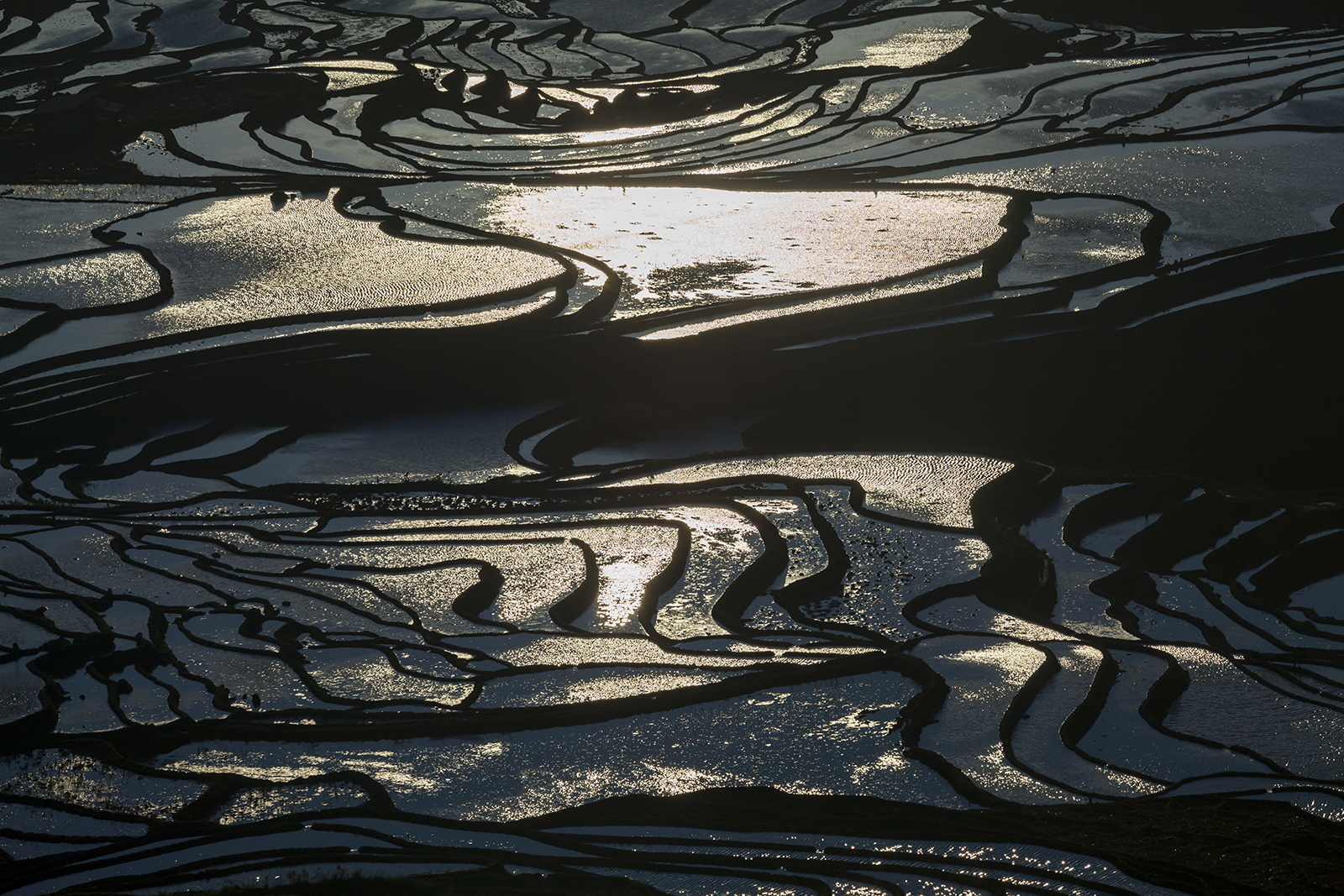 太阳向着山峰滑落了一段,逆光更加强烈了,反射在梯田的水面上,就像照射在平滑的镜面上,反射出耀眼的白光,把梯田变成了一个黑白的世界。黑色的田埂和白亮的水面,就像是一幅巨大的水墨画,而画面中一栋突兀的小屋,一排笔直的树木和一缕袅袅的炊烟,把这幅水墨世界又变成了立体的画卷。