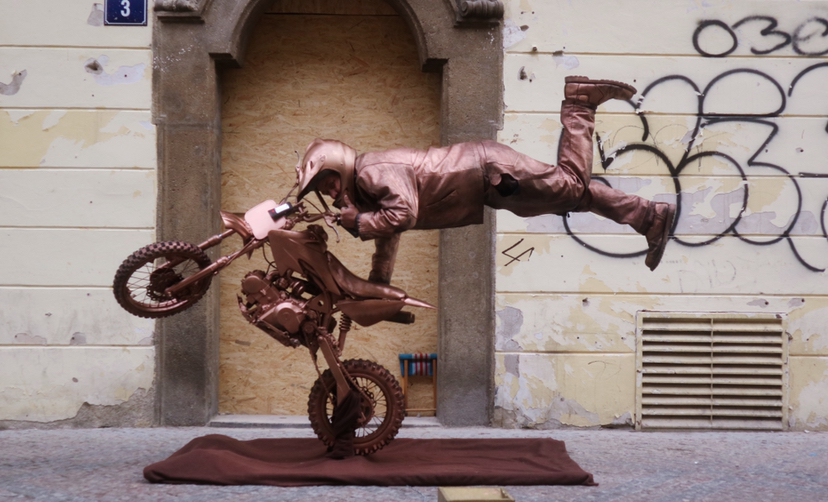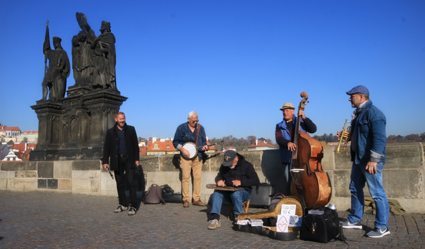 查理大桥上的乐队,大桥全长516米,有16个桥墩,是14世纪最具有艺术价值的石桥,桥的另一头是布拉格城堡区。桥上有30组圣者雕像。