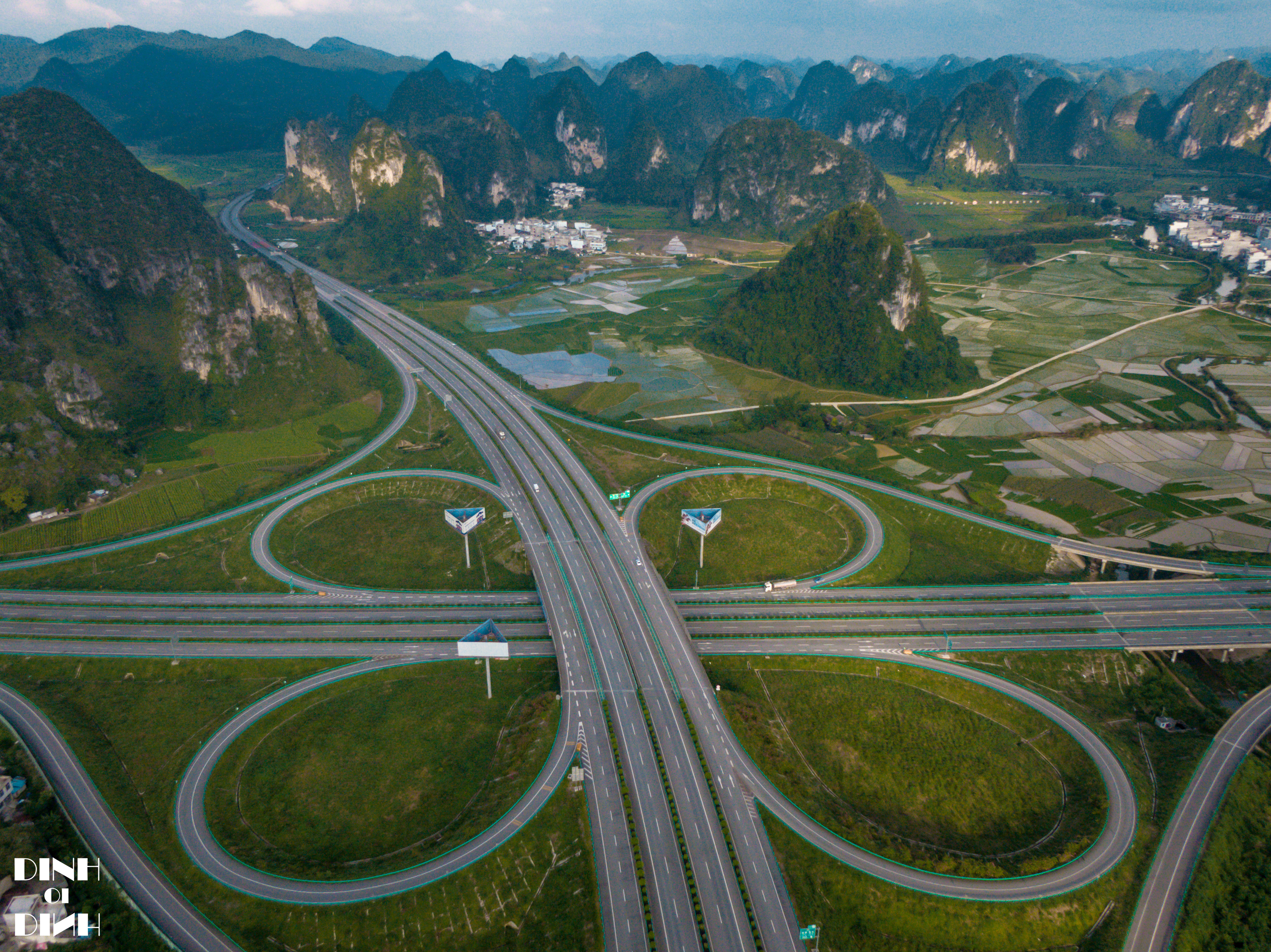 临出发前一晚,我突然想起来,之前很多号推荐的最美高速不就是我们要走的这段嘛,一直记着那张最美高速的图片,是个航拍,高速公路像个花朵一样的造型,远处是喀斯特的群山,近处是金黄的稻田,还有晨雾缭绕,在各大平台找了半天,都没找到这个点的具体位置,于是打算用最笨的办法,我打开了手机地图,崇靖高速对吧,我从 崇左 开始,看着卫星地图,一点一点的找花朵造型的路,结果从 崇左 一路找到了 靖西 ,在 靖西 下高速的口子我才找到了它。。。我是翻了整条高速在结尾找到了,虽然过程有点惨,但是最后还是找到了,很开心。不得不说,去 靖西 不管是合那高速还是崇靖高速,又或者是和 越南 紧挨着的 延边 公路,沿路的风景都是在别的地方不曾看到过的好山好水。
