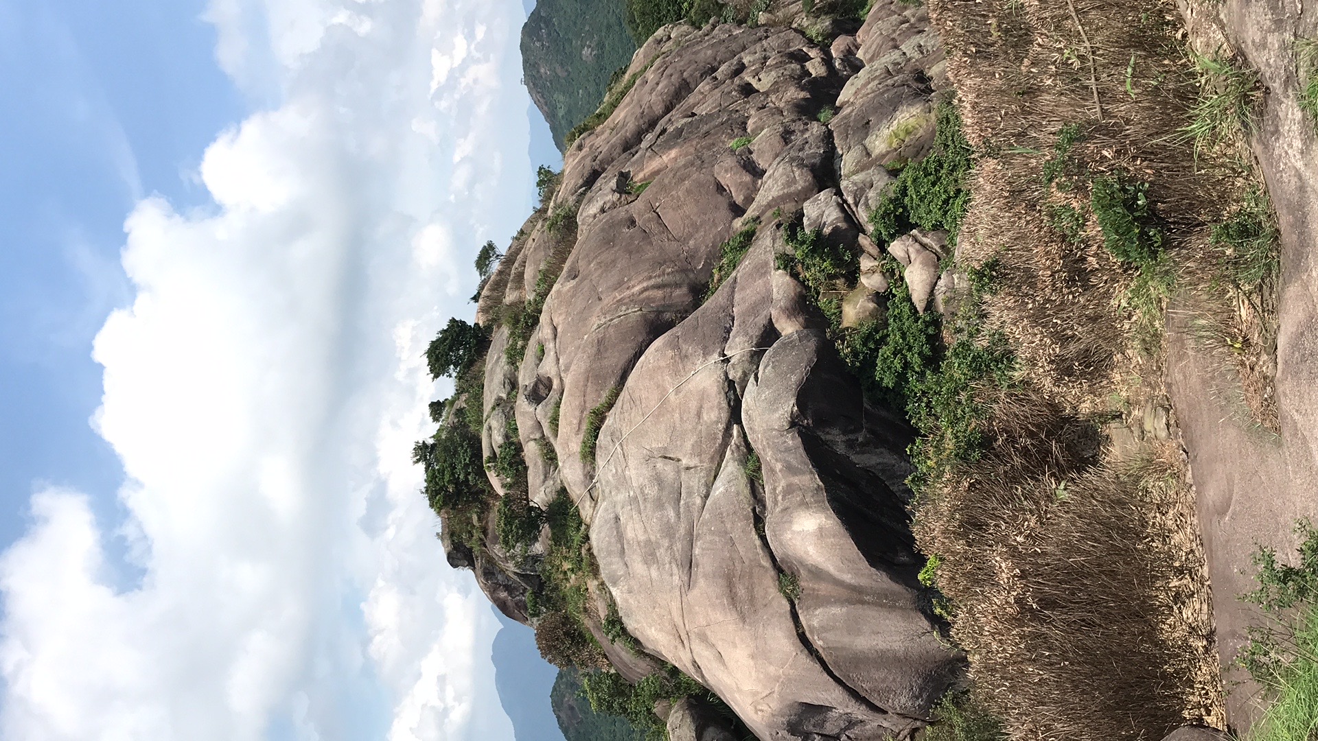 第四段:1公里,爬升100m。灌木丛中钻出,眼前一片开阔,天空放晴,蓝天白云,近在眼前,放眼远眺,江山美景尽收眼底,舒坦,享受。这是山脊线,两种地形穿插,箬叶竹林+石滩,行走在其中绝对是一种享受,前面的苦和累都是值得的。